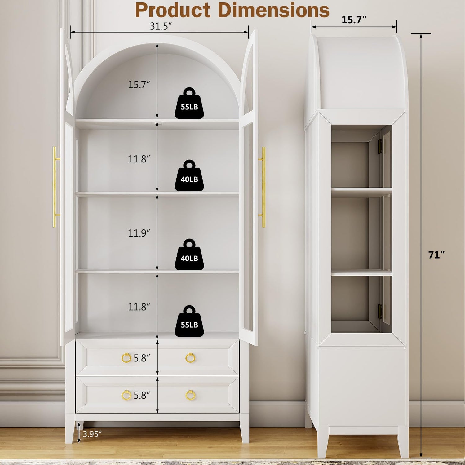LVSOMT 71" Tall Arched Storage Cabinet with Glass Doors and Drawers, Curio Display Cabinet with Adjustable LED Light & Human Sensor, 4-Tier China Cabinet for Living Room(White)