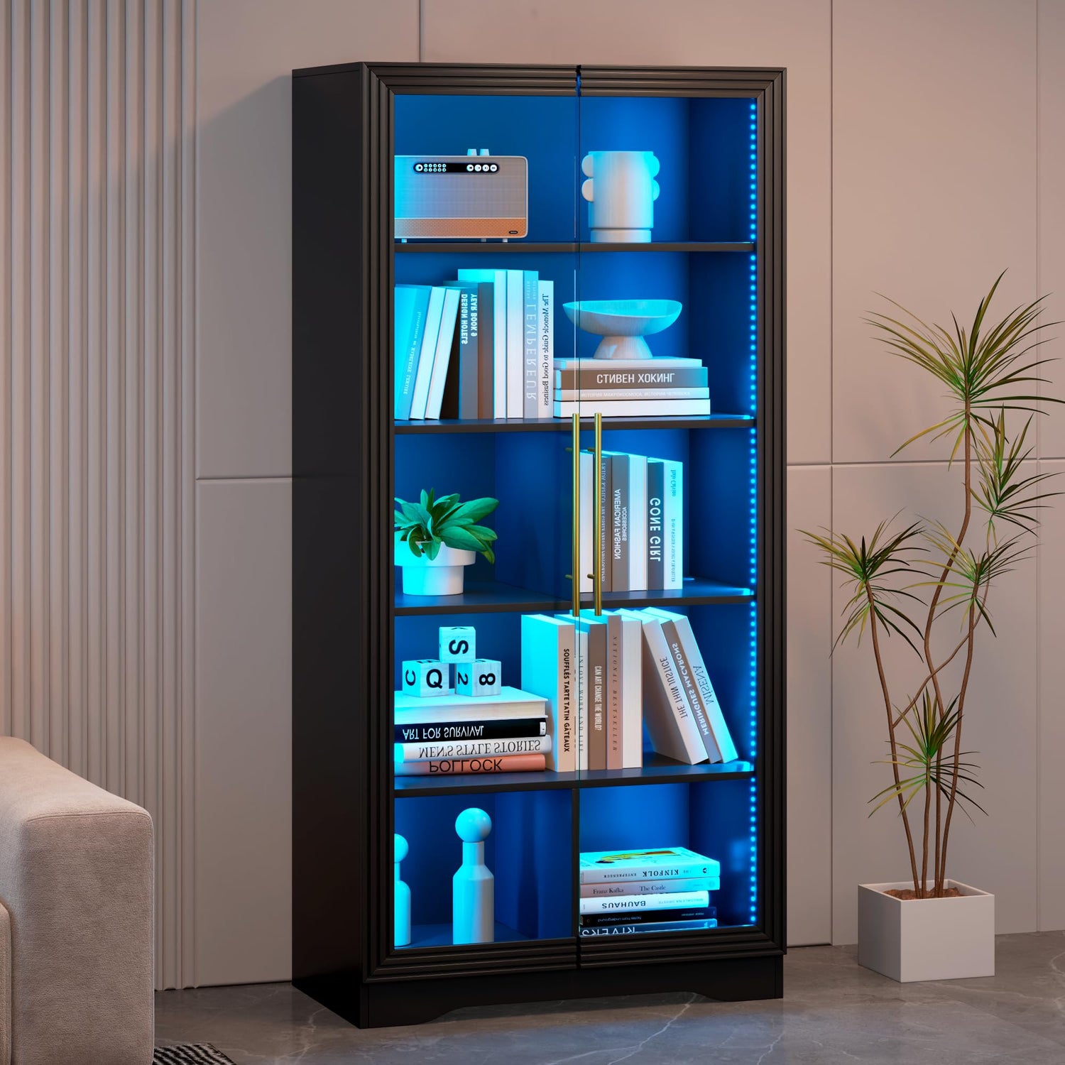 LVSOMT Display Cabinet with Glass Doors, 65" Tall Bookcase with 3 LED Lights/Human Body Sensor, 5 Tier Display Cases for Collectibles, Adjustable Storage Shelves, Home Office, Living Room, Black