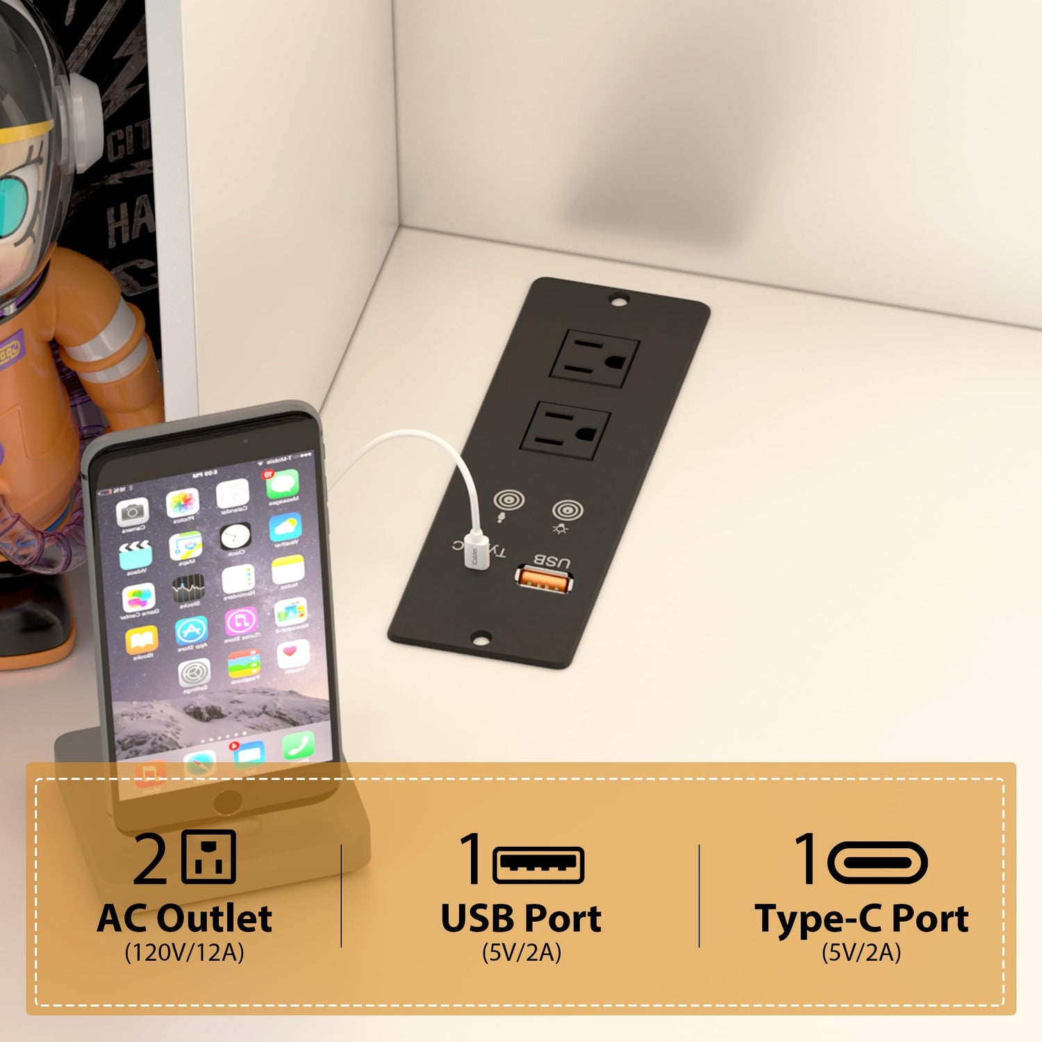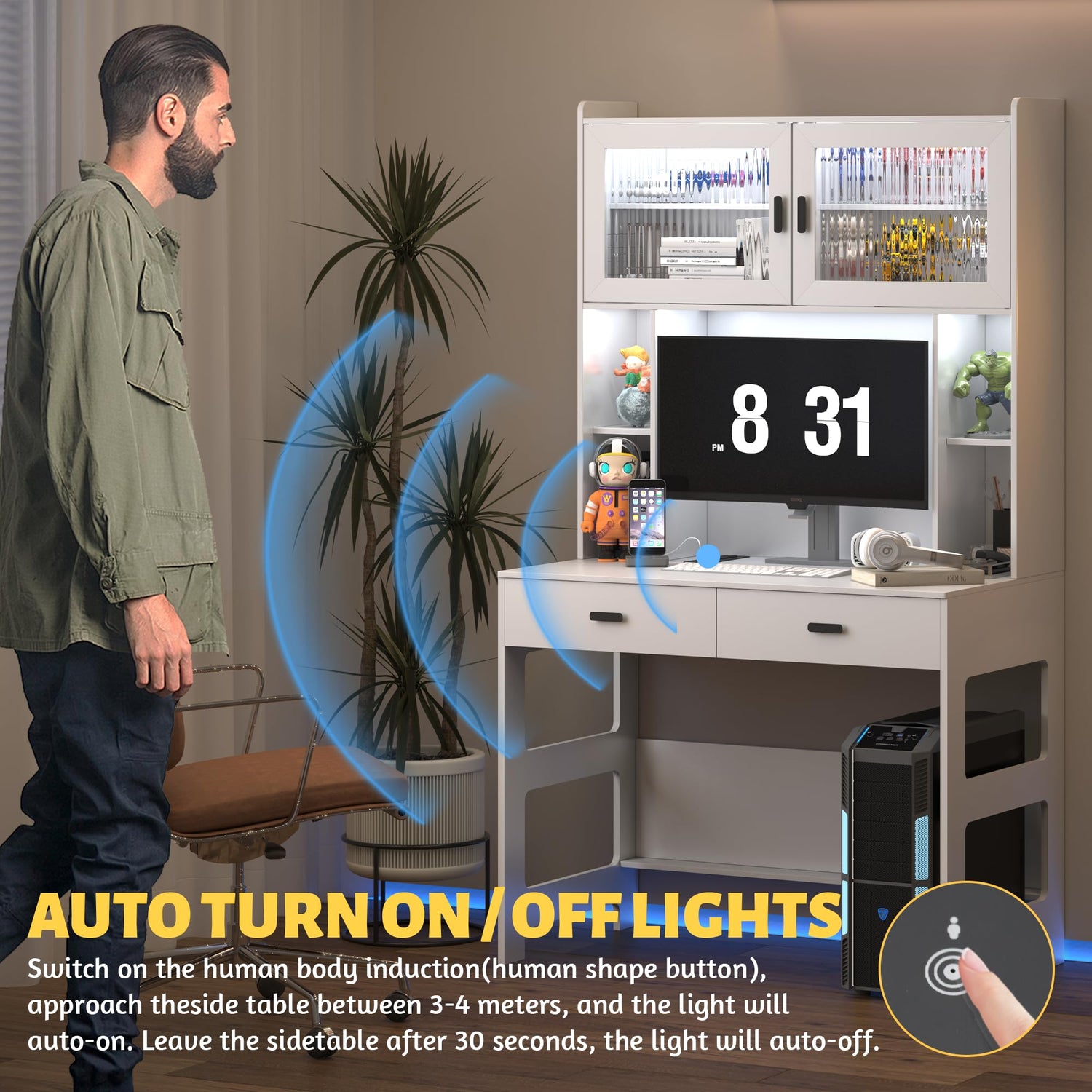 - [LED Lights & Power Outlets] - This laptop table has 3 colors LED Lighting: white, daylight, warm, with dimming brightness function. It can auto-turn ON/OFF by the human body induction. When people approach, the light turns on, and when people leave, the light turns off. 2 Standard Plug Outlets & 1USB Charging Port & 1 Type-C port, allows you easily to charge mobile devices, laptops, and iPad while working, studying, playing gaming or watching movie.