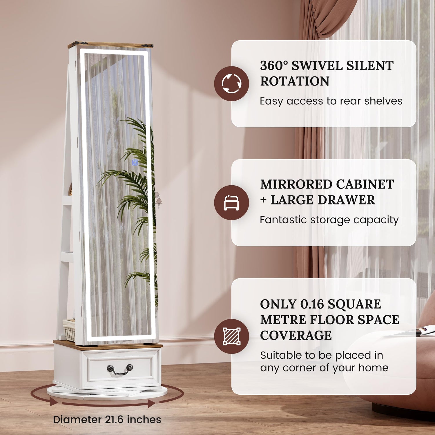 - Full-Length Mirror with Adjustable LED Lights: This rotating jewellery cabinet features a full-size mirror with adjustable LED lighting in 3 brightness levels and a smart memory function - you can use the touch button to find the perfect lighting to check your look