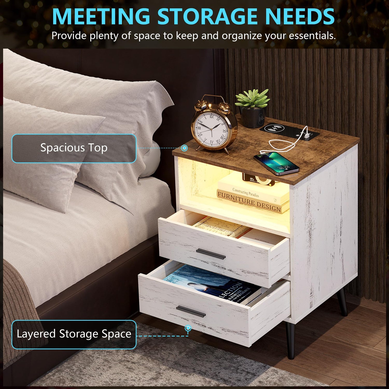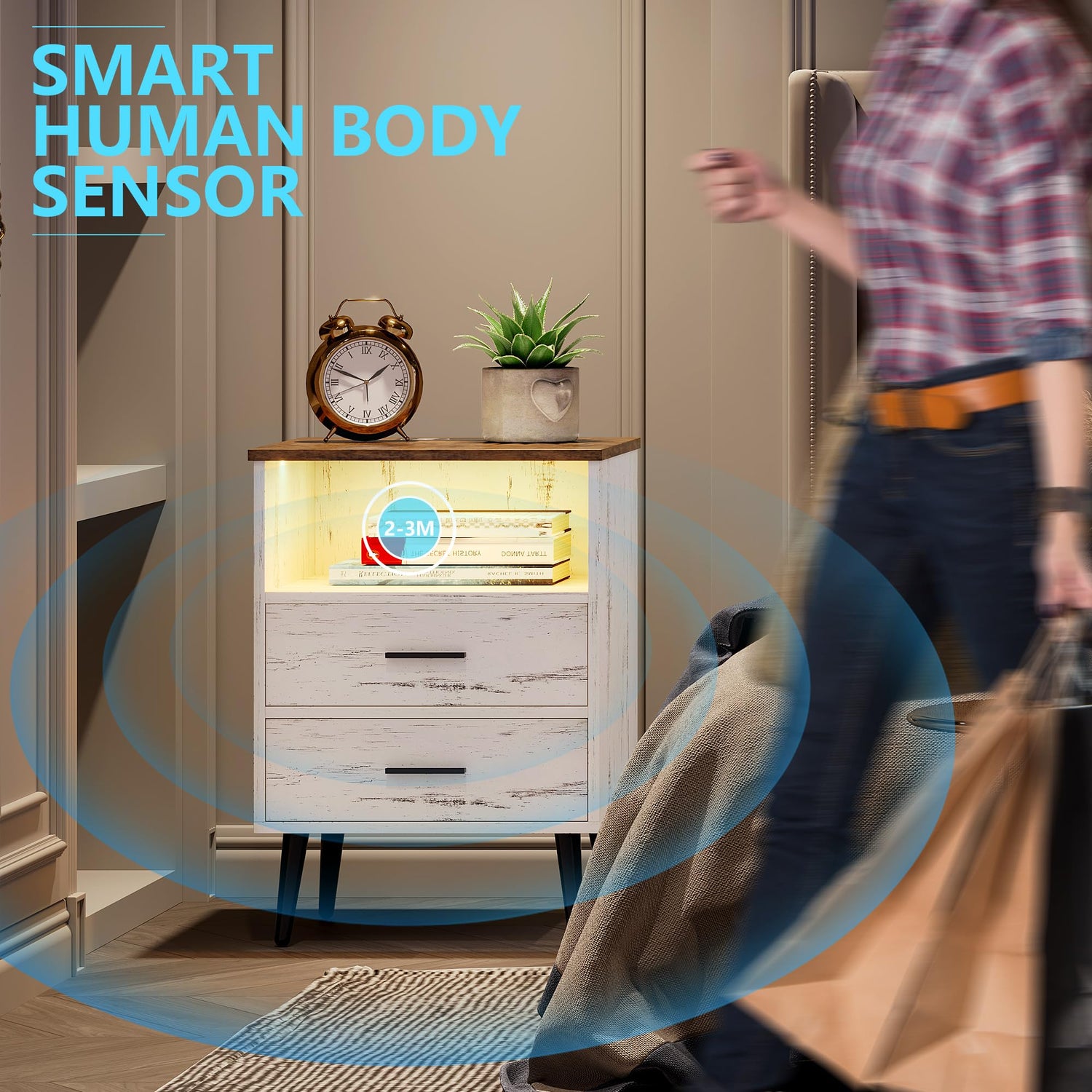 LVSOMT Nightstands Set of 2, White Nightstand with Charging Station, Night Stands with Human Body Induction, Bedside Tables with 2 Drawers, Open Shelf, Modern Night Stand for Bedroom