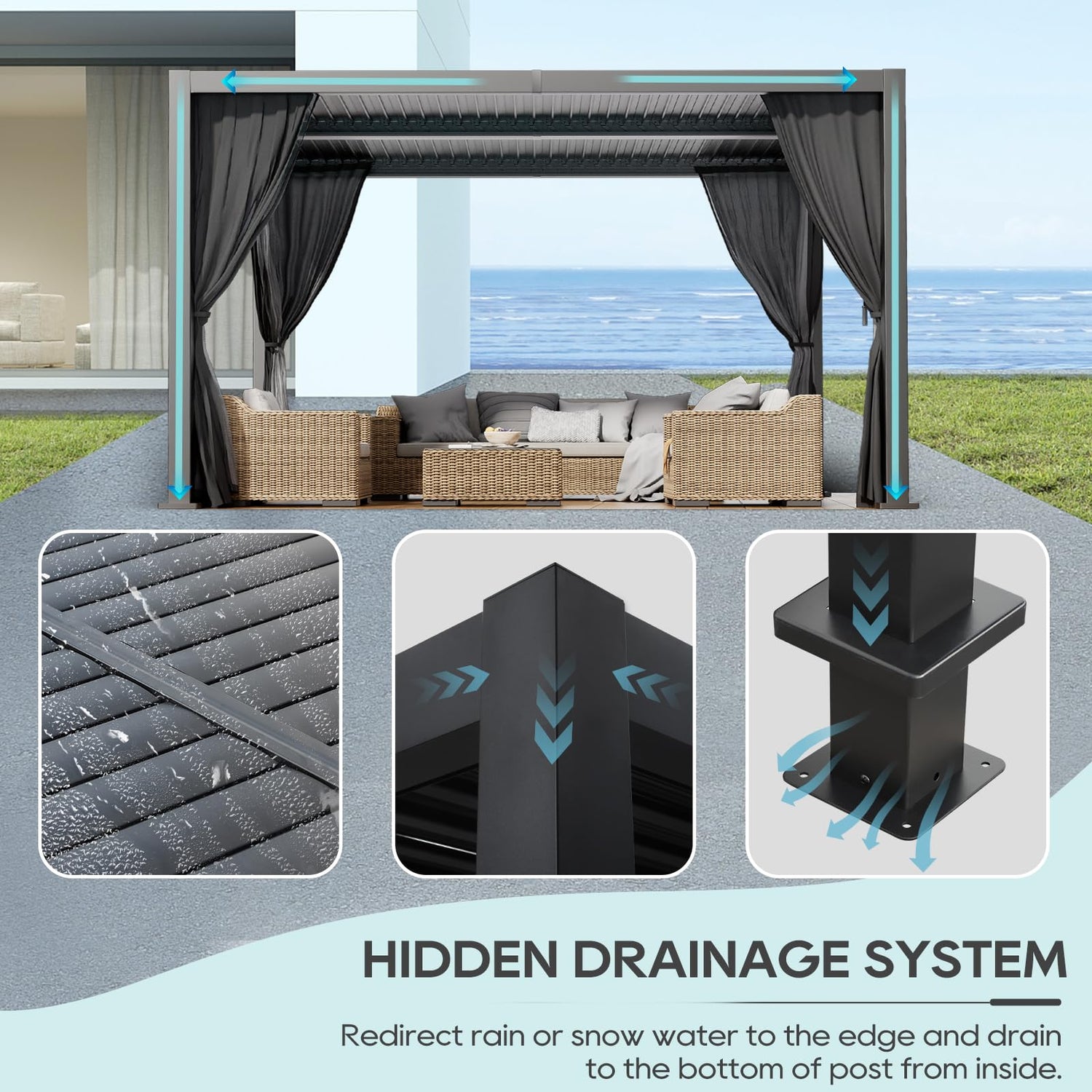 - 【Hidden Drainage System】Featuring a built-in gutter system, our patio pergolas efficiently channel rainwater to the columns, preventing water accumulation on the roof and keeping the area underneath dry, even during rainy or snowy days