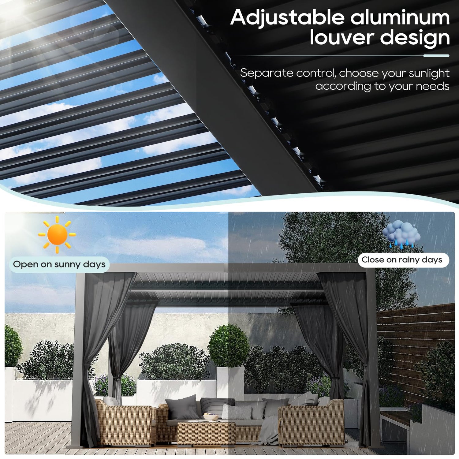 - 【Adjustable Roof】Equipped with two independently controlled louvered roofs, our aluminum outdoor pergola offers effortless angle adjustment to control sunlight and shade. When fully closed, it provides excellent shelter from rain