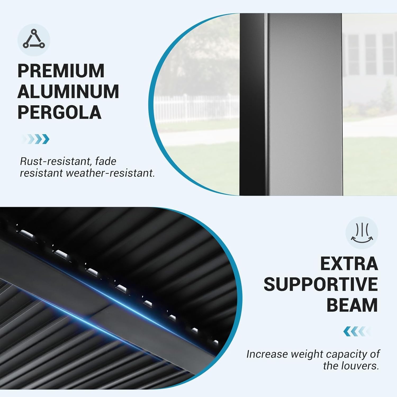 - 【Durable Aluminum Pergola】Our louvered pergola is expertly crafted from powder-coated aluminum, ensuring a sturdy and rust-resistant design that stands up to the elements. This aluminum pergola will enhance your outdoor space while providing long-lasting durability for your patio, backyard, garden, or deck.
