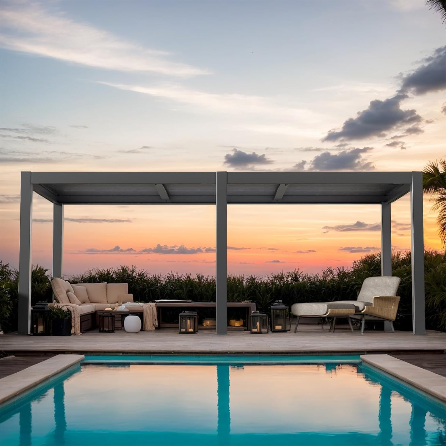 - 【Adjustable Roof】Enjoy complete control over your outdoor environment with our outdoor pergola featuring independent adjustable roofs that can tilt from 0° to 90°. This unique design allows you to easily manage sunlight and shade, creating the perfect ambiance while also offering shelter from rain when fully closed.