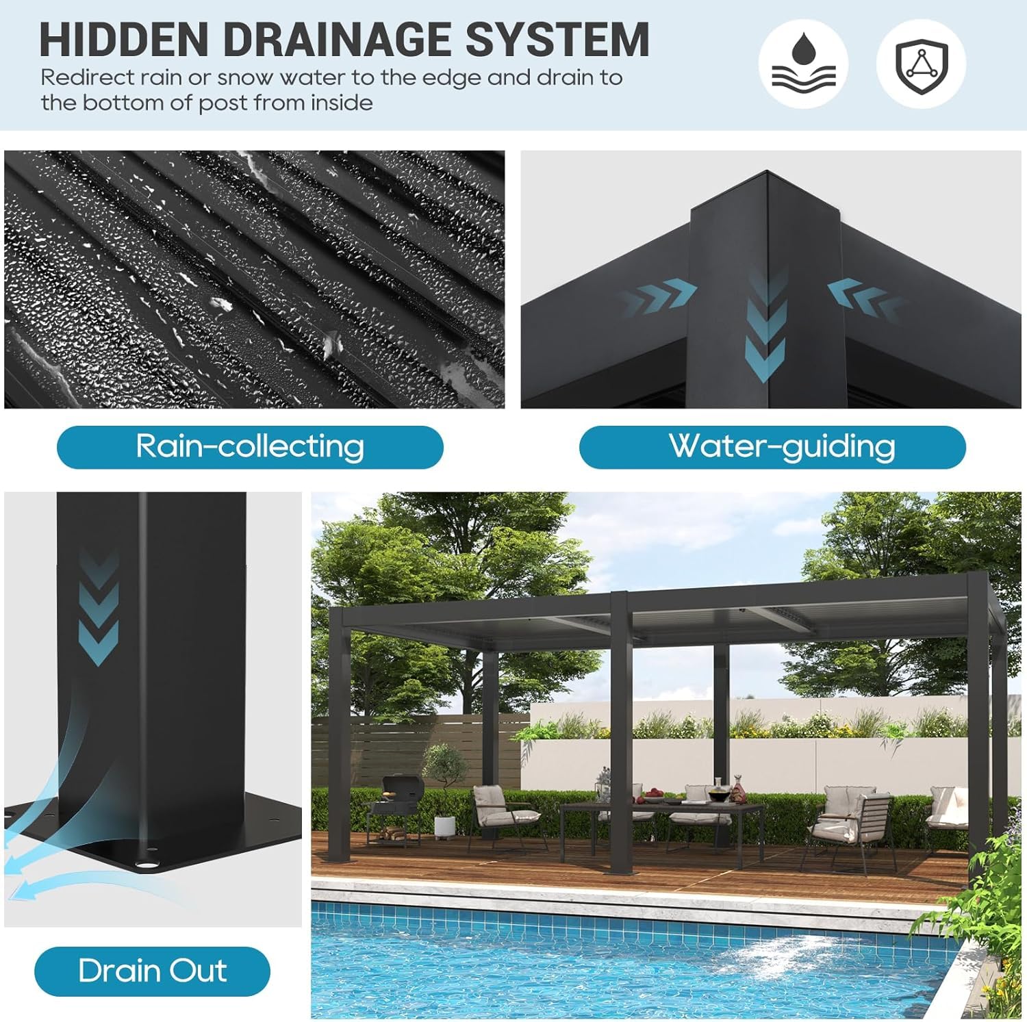- 【Innovative Drainage System】Say farewell to water buildup! Our weatherproof pergola includes a built-in gutter system that efficiently directs rainwater away from the column, preventing accumulation and ensuring you can relax under your gazebo even on rainy days.