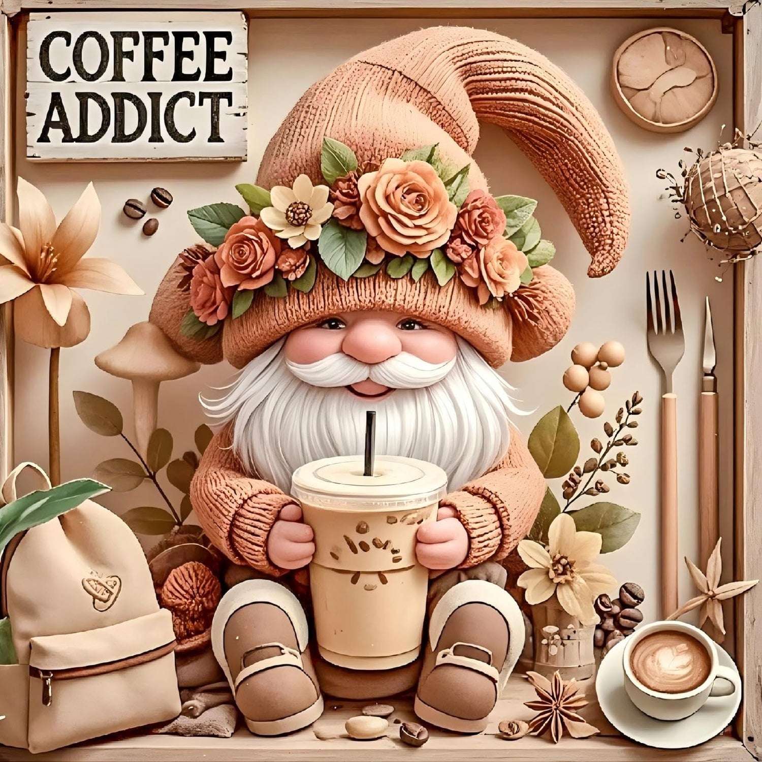 Details: Gnome Drinks Coffee Design Diamond Art Kits for Adults