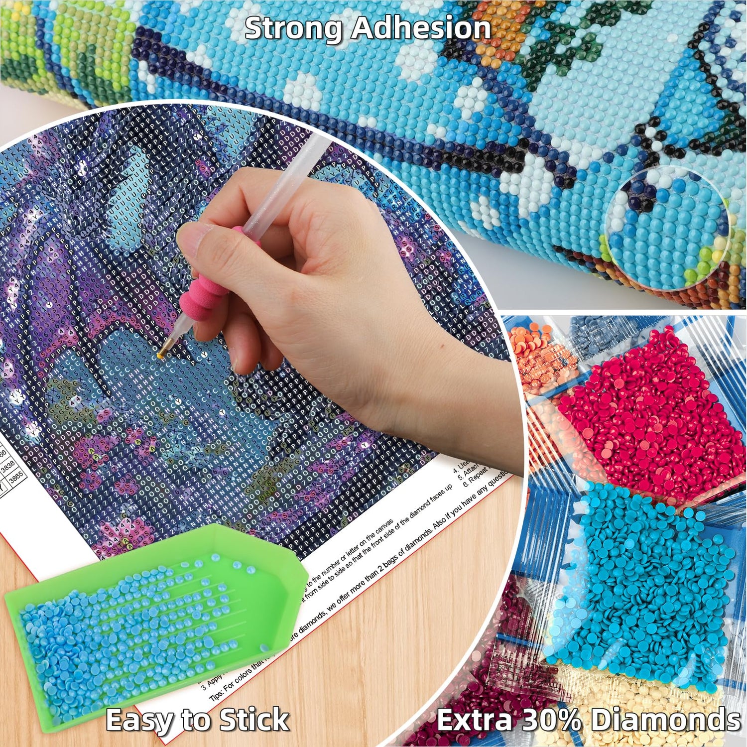 - All Tools in Need Offered: Package includes 1 x HD printed canvas, 1 x pen, 1 x tray, 1 x glue clay, 5 x sealed bags and enough colorful diamonds. An extra 30% beads are provided so that the diamond painting kits can be completed smoothly