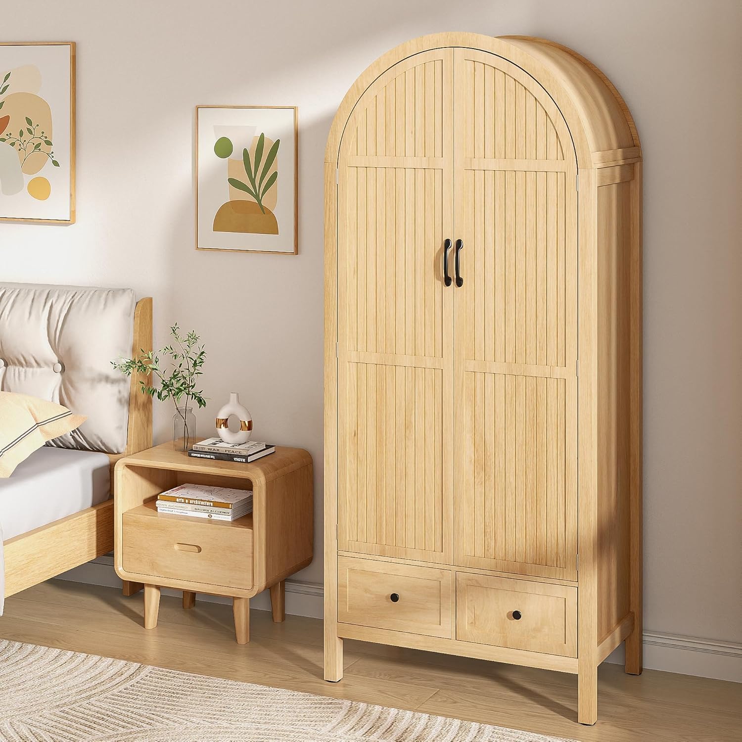 - Elegant Modern Farmhouse Style: Our wardrobe features a farmhouse style with an arched exterior, 2 doors with grooved panels and metal handles, perfectly blending a modern country aesthetic with the warmth of a vintage farmhouse, complementing a variety of decor styles in your living space