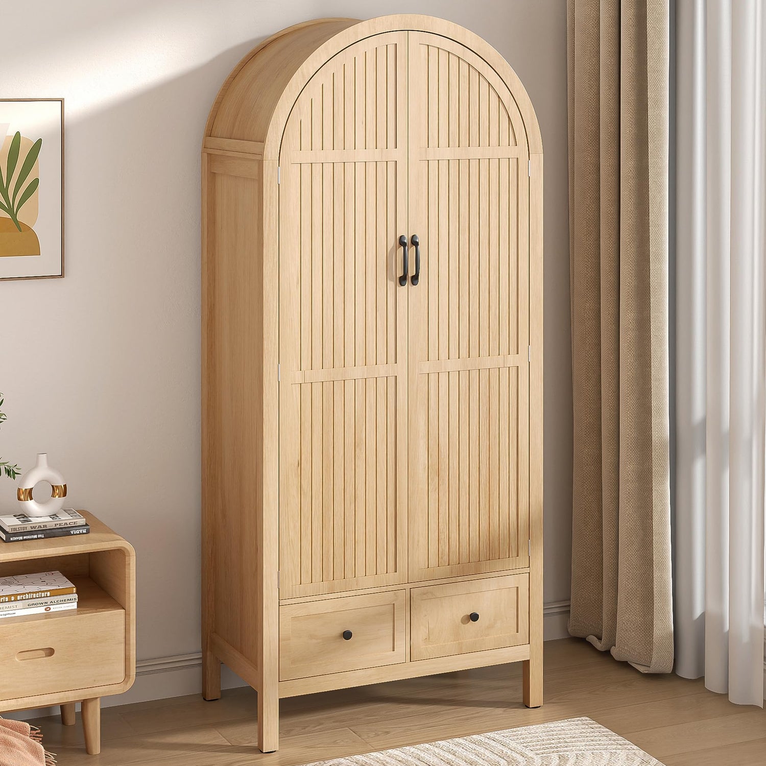 Lxsxlome Wardrobe Closet, Armoire Wardrobe Closet with Drawers and 2 Arched Fluted Doors, 70.87‘’ Tall Wooden Bedroom Armoires with Shelves and Hanging Rod (2, Wood Color)