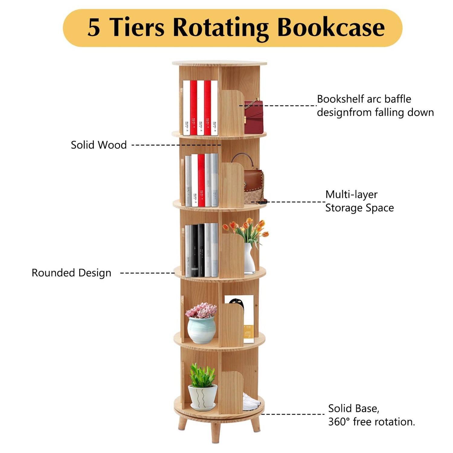 LyeXD 5-Tier Rotating Wooden Bookshelf - Multi-Functional Floor Stand Storage Rack
