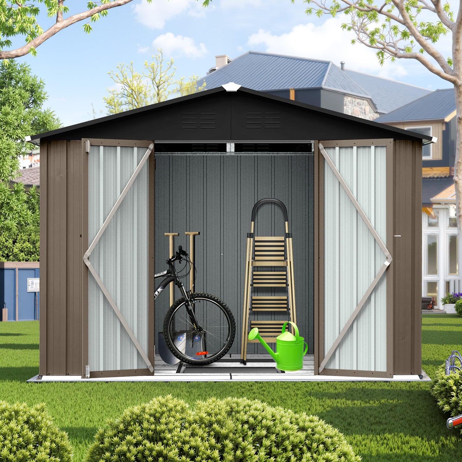 Lyngins 8x6 FT Outdoor Storage Shed, Metal Tool Shed with Lockable Doors, Peaked Roof & Frame Floor, Garden Shed with Vented Design for Backyard Garden Patio Lawn, Brown + Black