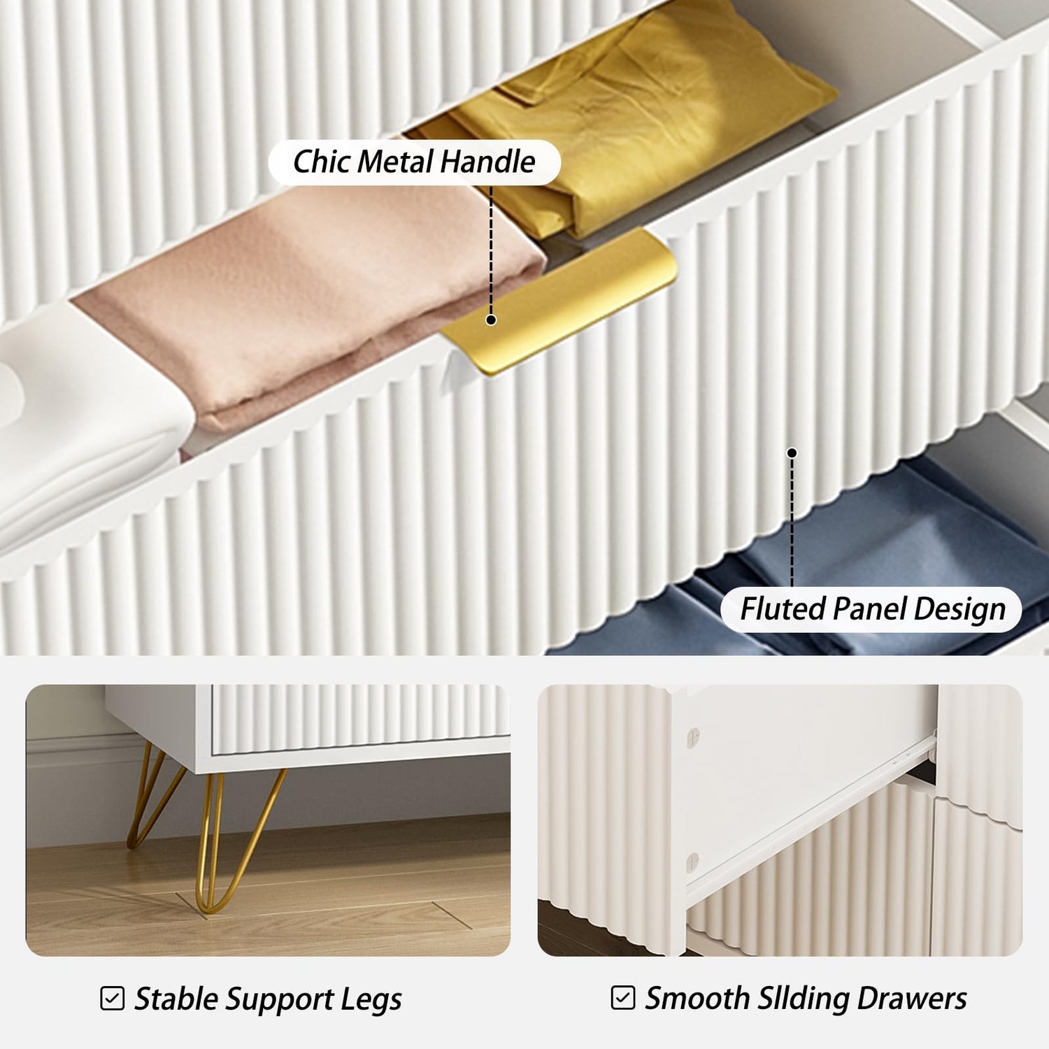 - Spacious Storage & Organization: Featuring 6 spacious drawers with sleek metal pulls, this white fluted dresser provides ample space for organizing clothes, makeup, photo albums, and more. The top surface is perfect for decorative items like plants or mirrors, enhancing your room’s aesthetic.