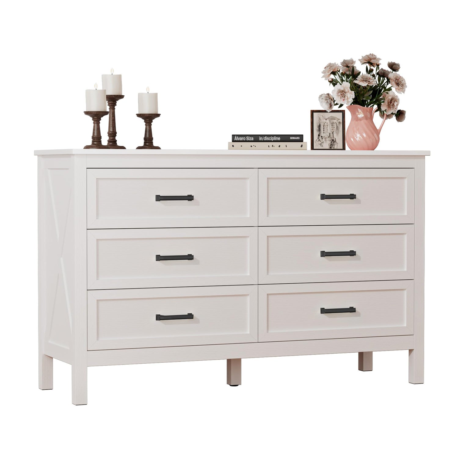 - FARMHOUSE 6-DRAWER DRESSERS: This bedroom dresser exudes rustic charm with its beautiful farmhouse style design. The crisp white finish combines with the natural wood grain to create a warm and inviting look. Whether placed in a bedroom, living room or hallway, this white dresser brings a cosy rustic feel to your home, blending effortlessly with both modern and traditional interiors.