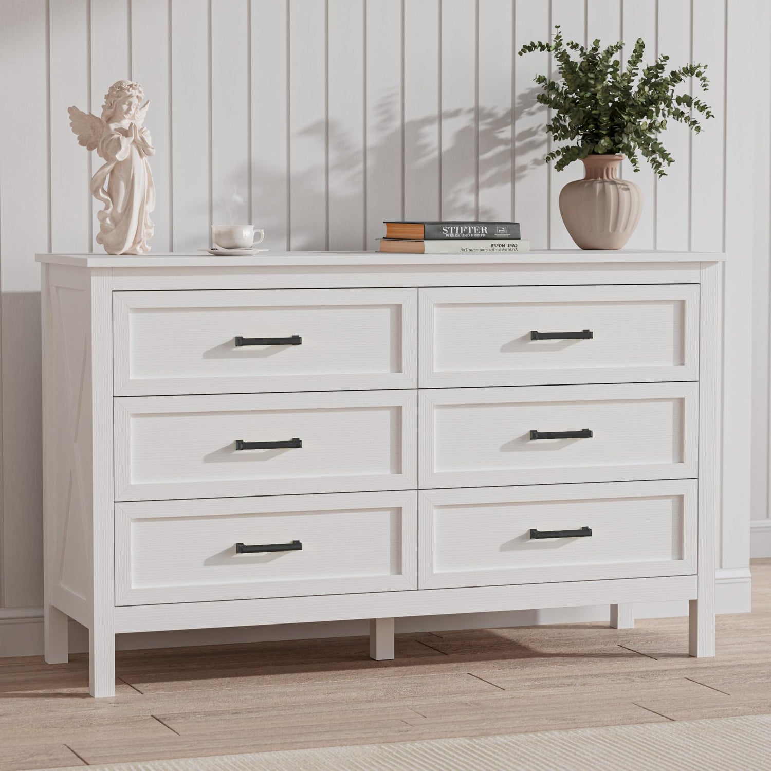 LYNSOM Farmhouse 6 Drawers Dresser for Bedroom, Wood Rustic Wide Chest of Drawers with Deep Drawers, Metal Handle, Storage Dressers Organizer for Entryway, White
