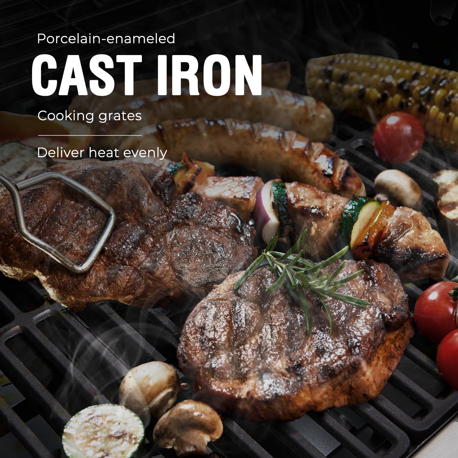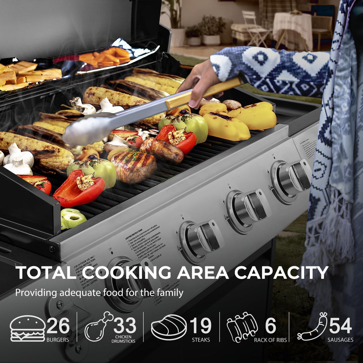 - 【Enhanced Heat Control with More Burners】This outdoor gas grill features 4 main burners and 1 side burner, delivering a total of 49,000 BTU; Perfect for searing steaks and cooking with pots and pans, it offers precise temperature management