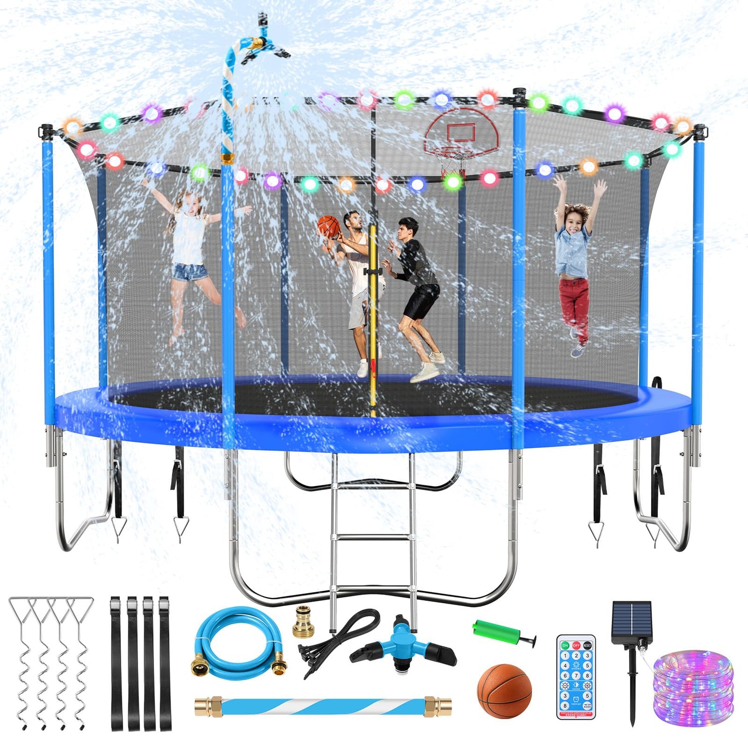 Lyromix Upgraded 12FT Trampoline for Kids and Adults, Large Outdoor Trampoline with Stakes, Light, Sprinkler, Basketball Hoop and Net, Capacity for 4-6 Kids and Adults