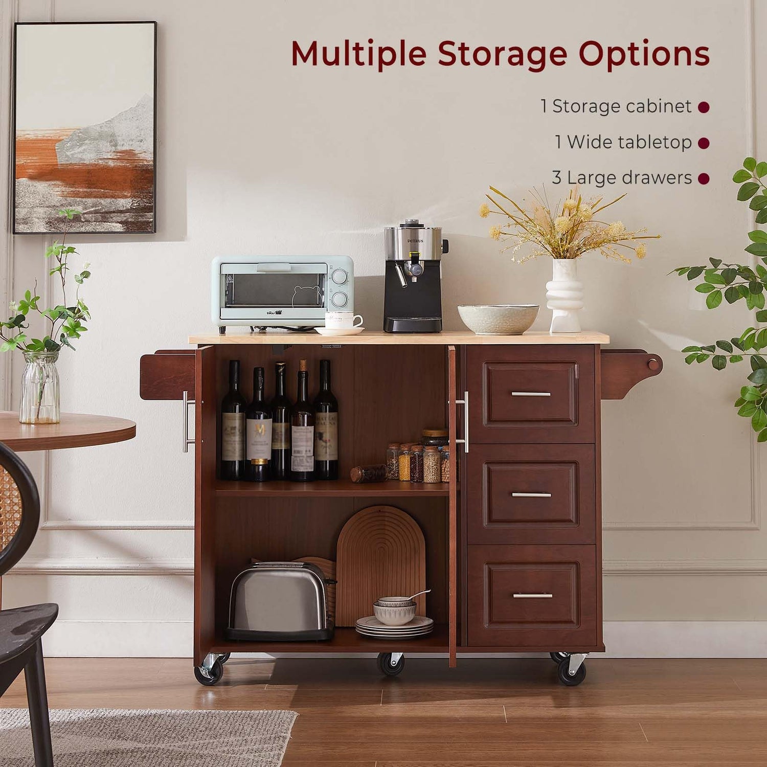 Lyromix Walnut 54" Rolling Kitchen Island Cart with Storage, Large Kitchen Cart with Folding Drop Leaf Breakfast Bar, Wood Island Table for Kitchen with 3 Drawers and Spice Rack & Towel Rack, Brown
