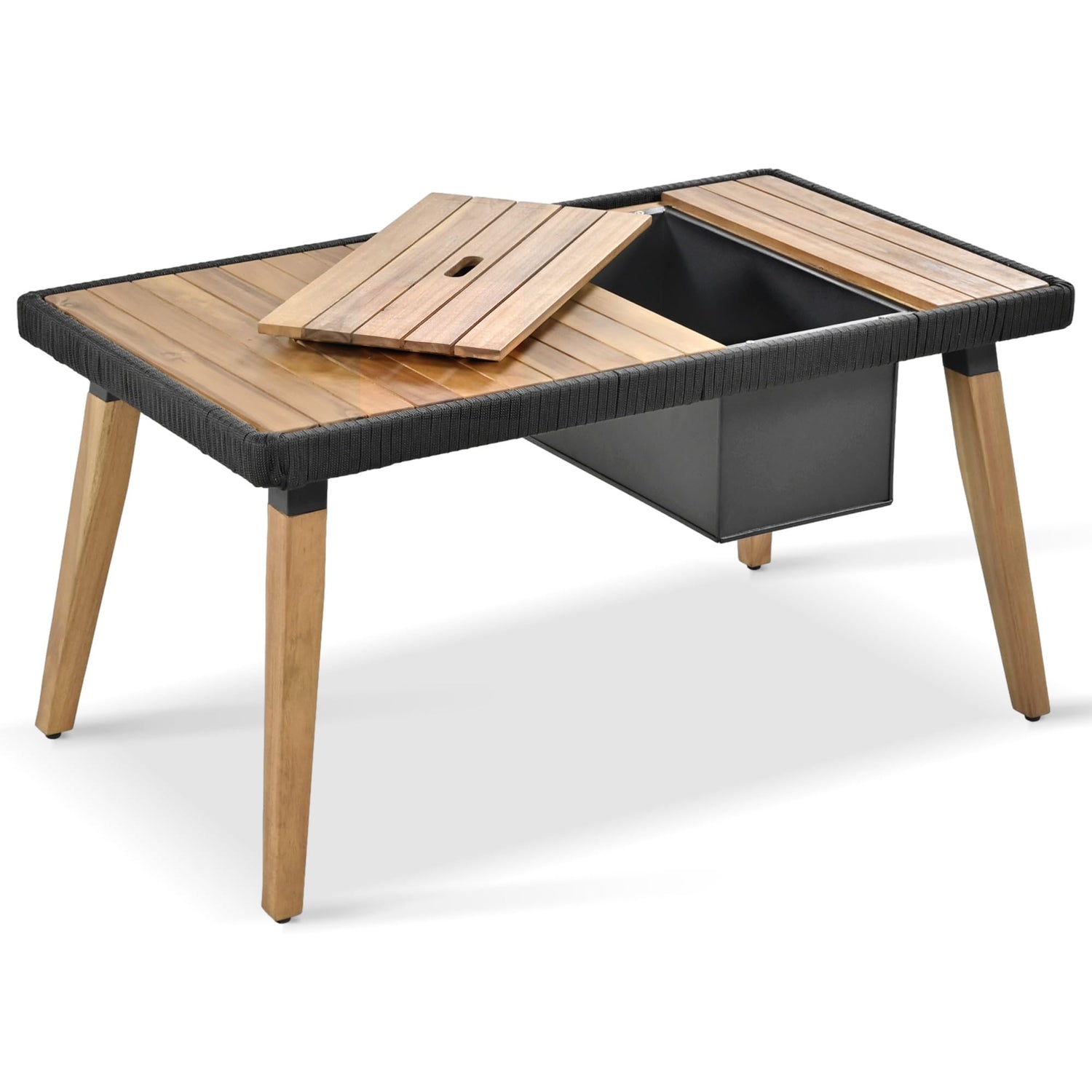 At the heart of this set is the versatile 2-in-1 Cool Bar Table. This innovative tabletop merges the robust nature of Acacia wood with the elegant aesthetics of rope weaving. It features a generous 15 L ice bucket capacity, allowing you to serve refreshing drinks effortlessly. The lid doubles as a stool and storage box, making it a practical addition that combines contemporary design with a touch of natural charm.