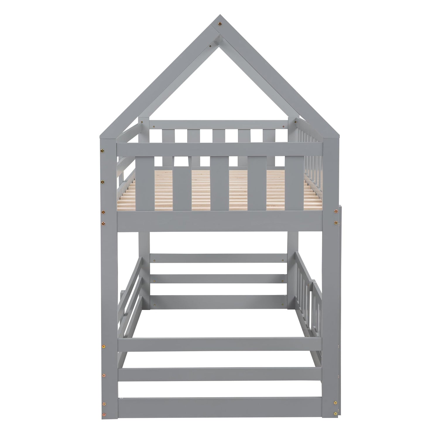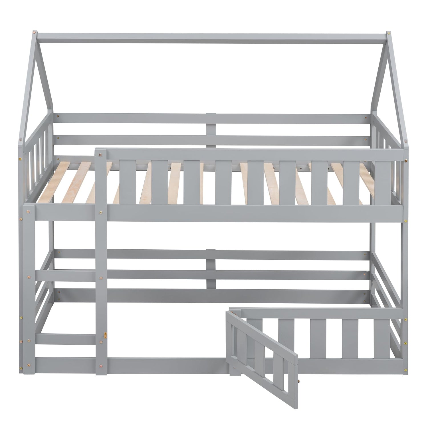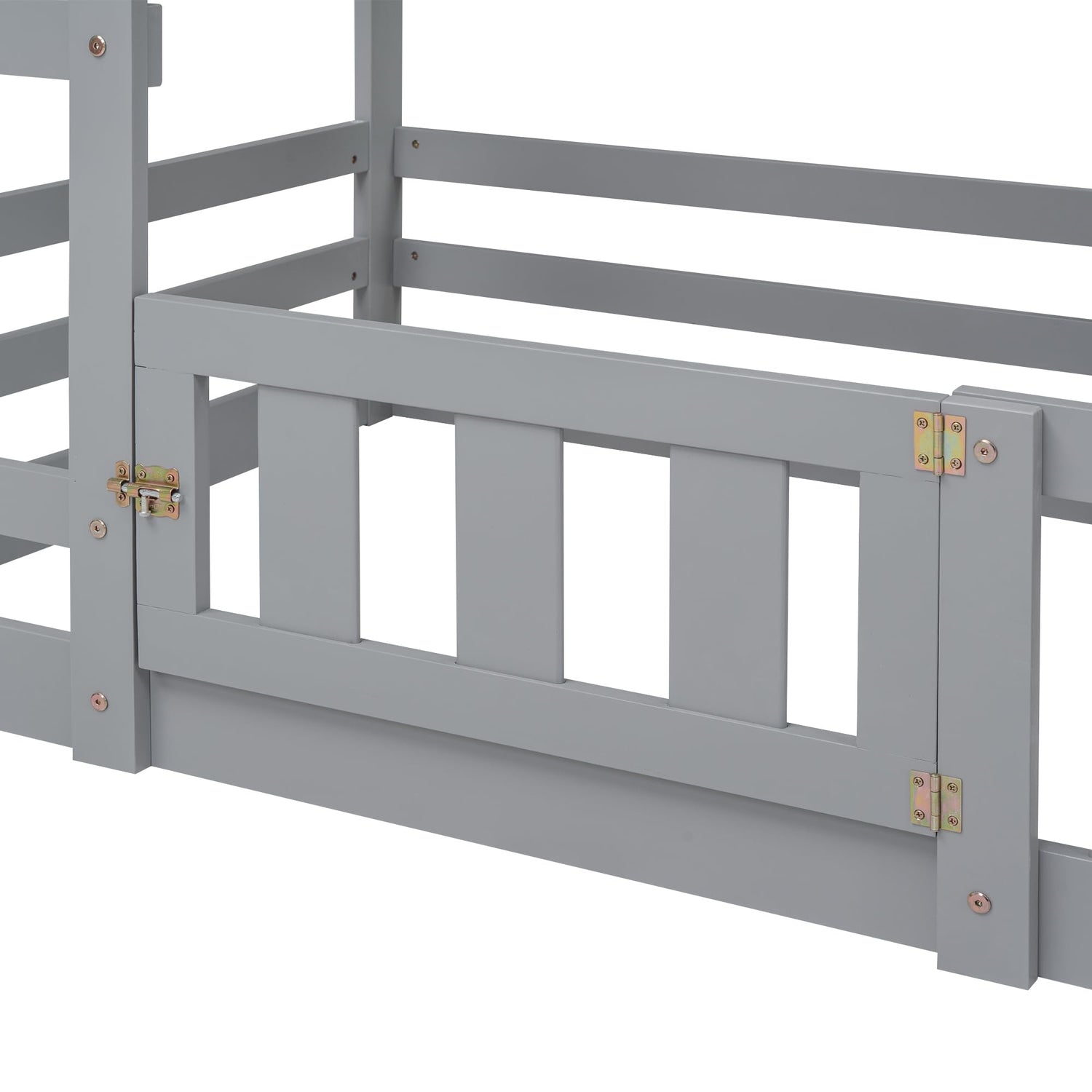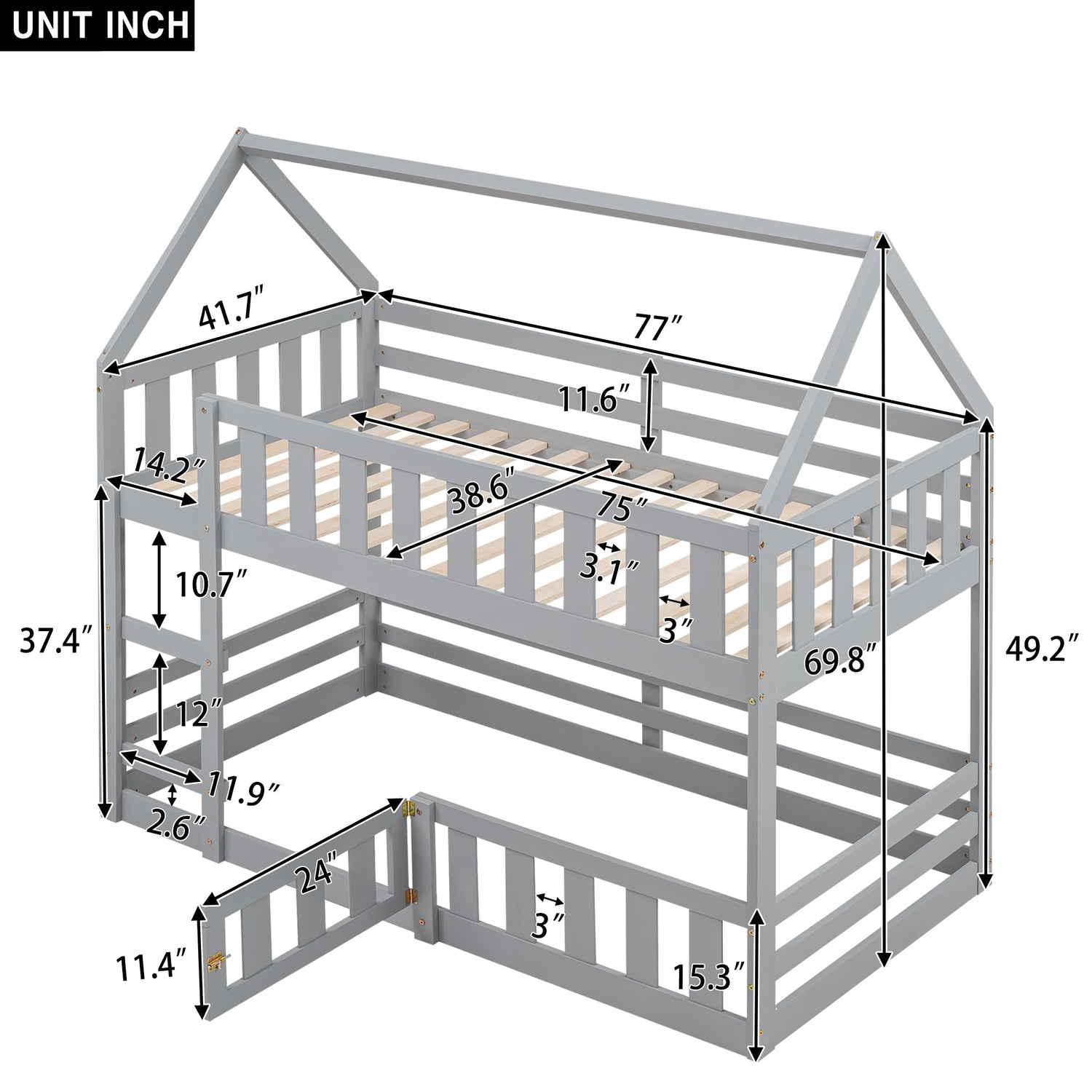LZ LEISURE ZONE Grey Twin Over Twin Bunk Bed with House Design, Safety Fence, and Playful Door