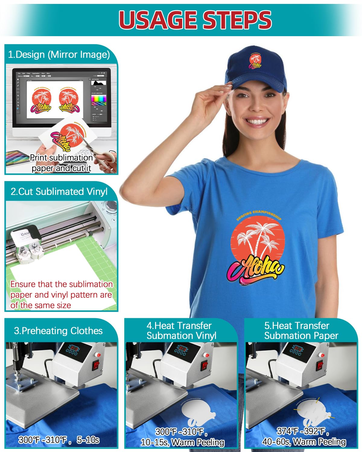 - Vivid Colors: Sublimated vinyl allows you to create with sublimation paper even on dark fabrics and pure cotton fabrics, restoring bright colors and clear patterns. Say goodbye to the limitations of traditional sublimation paper