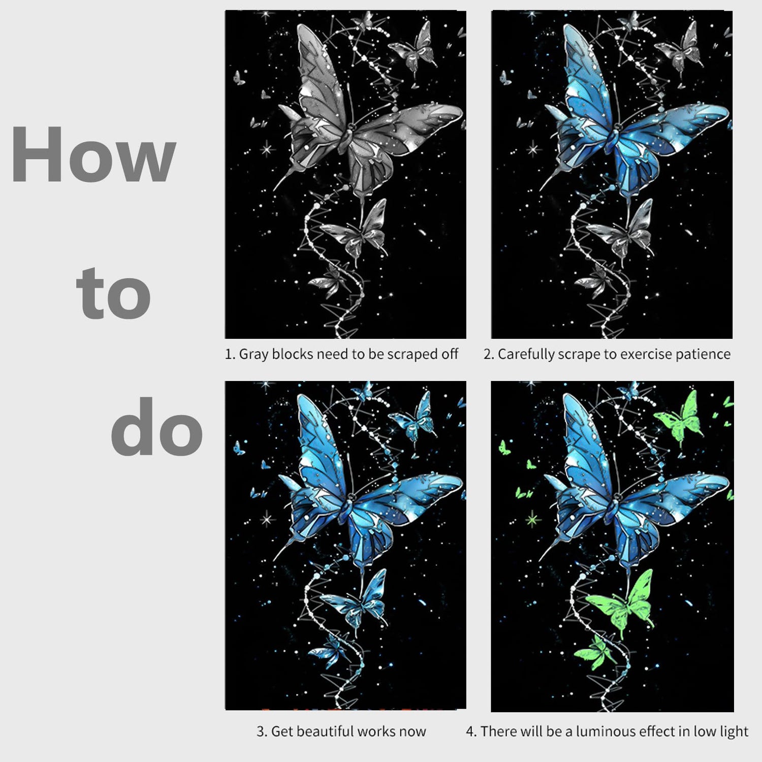- PACKAGE INCLUDING: 8 x GLOWS IN THE DARK Scratch Drawing Board(Butterfly/Dolphin), 3 x Scratch Pen, 1 x Clean Brush - A4 size. Great for developing fine motor skills, hand-eye coordination, and artistic expression, making it an ideal learning tool for home and classroom use