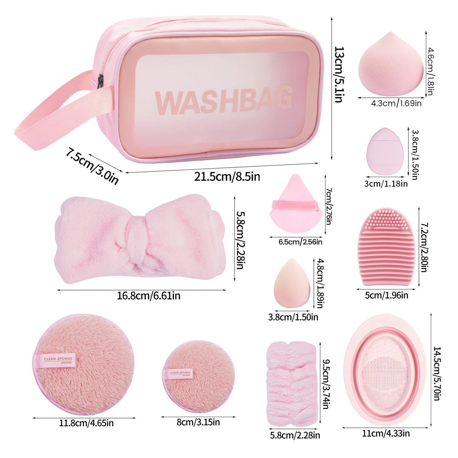- Package Included: 32pcs Professional Makeup Brush Set With a Velvet Bag, 5pcs Makeup Sponges, 5pcs Triangle Powder Puff, 3pcs Mini Thumb Puff, 2pcs Big & Small Makeup Remover Puff, 2pcs Cleaning Mat, 3pcs Face Wash Headband Wristband Set and a Toiletry Bag.