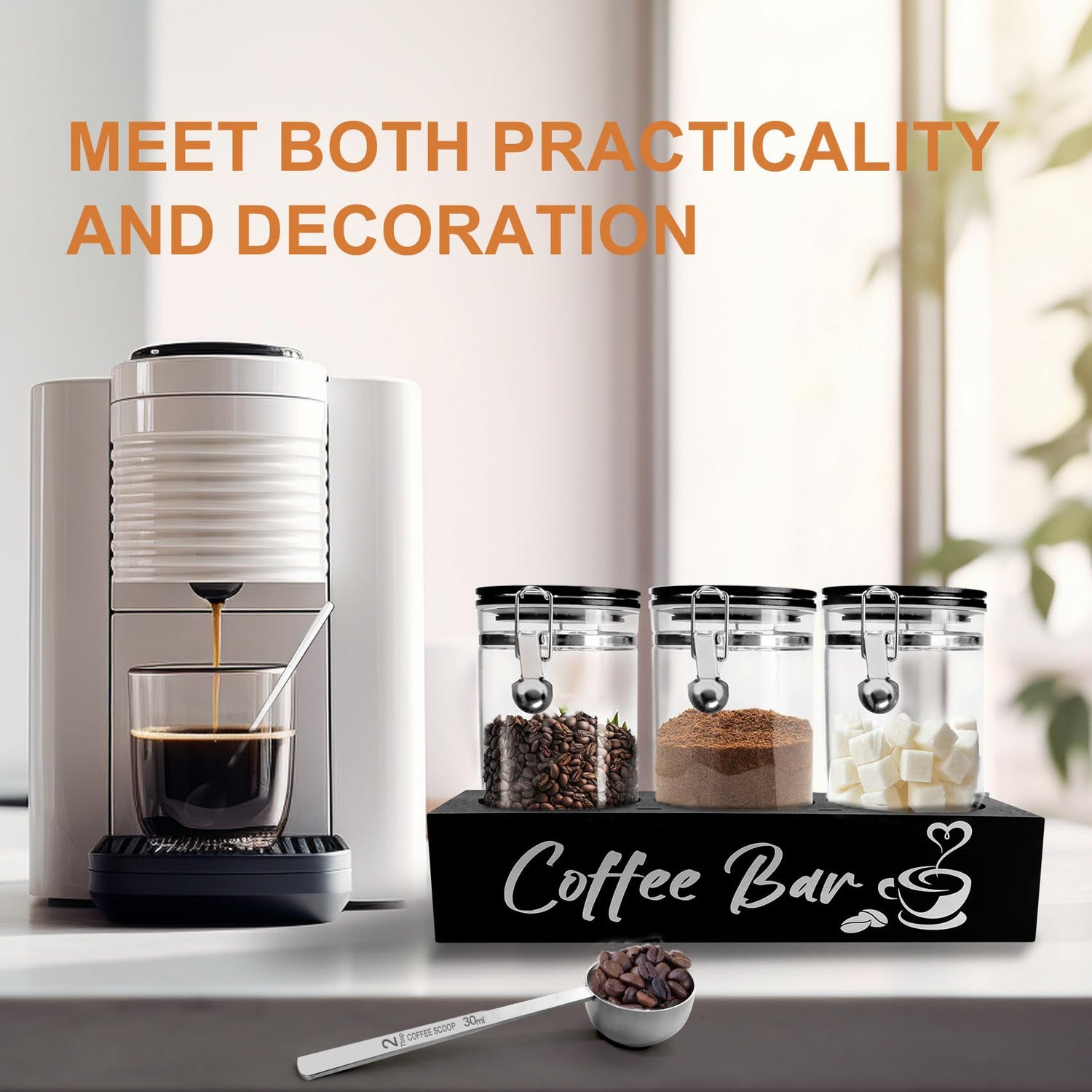 - 【Black Coffee Containers Match with Coffee Bar Style】coffee canister set on a black wooden shelf with “coffee bar” decoration can better fit in your coffee bar style. coffee canisters for countertop The whole set of coffee canisters has a unified black design, suitable for most coffee bar styles like black white, simple, modern, fashion, vintage style. It can be nicely matched with your coffee bar utensils and better fit into your home style, becoming a functional and good-looking coffee station