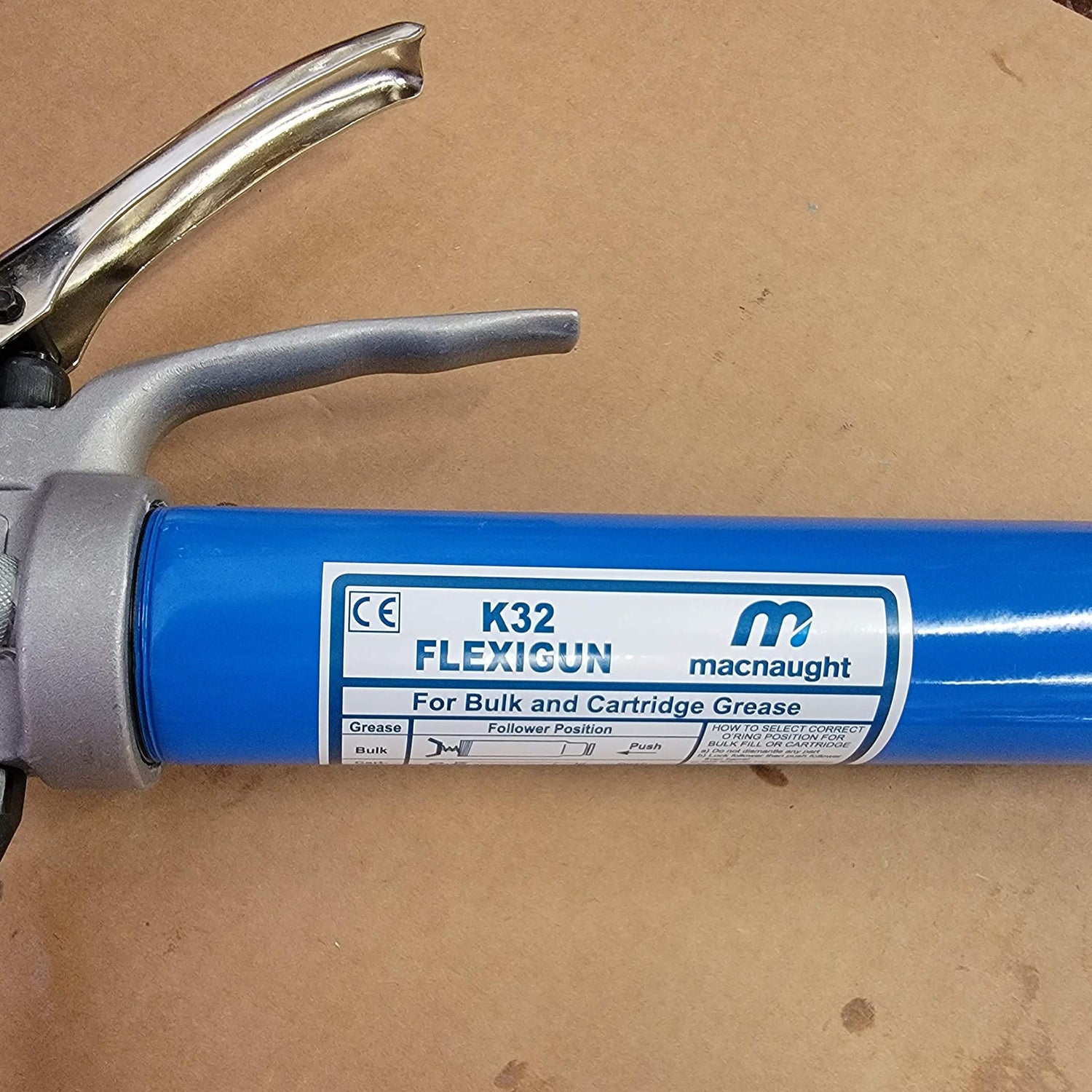 Details: A classic Macnaught grease gun, the Flexi gun incorporates a unique variable stroke piston and valve arrangement for true 'one handed' operation and can produce increased pressure through short strokes or high volume shot using a full stroke.