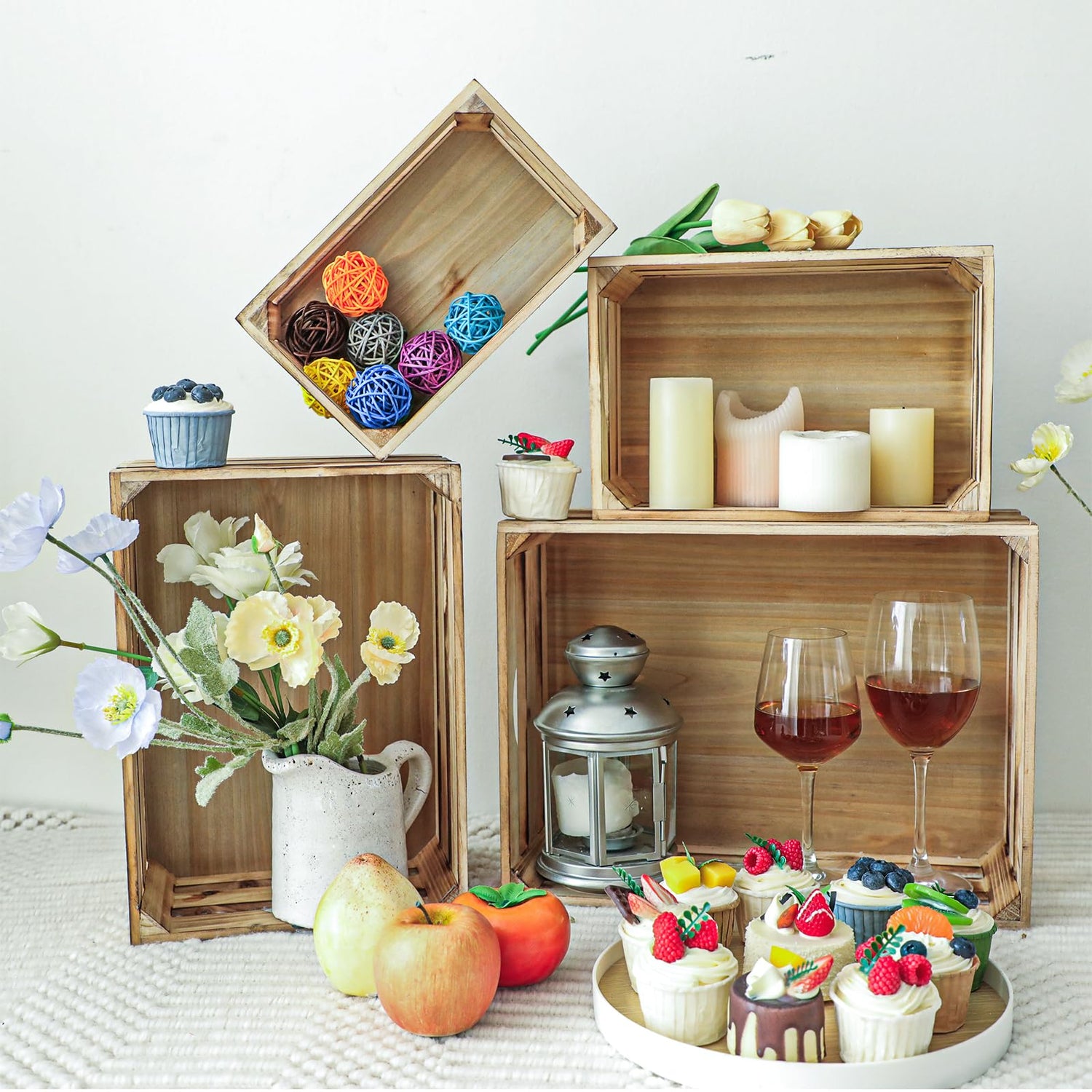 MACVAD Set of 4 Large Torched Wood Decorative Storage Crates, Nesting Wooden Crates for Display Rustic, Farmhouse Wooden Storage Container Boxes Made from 100% Wood