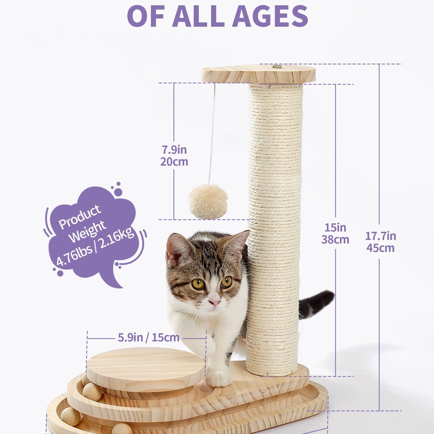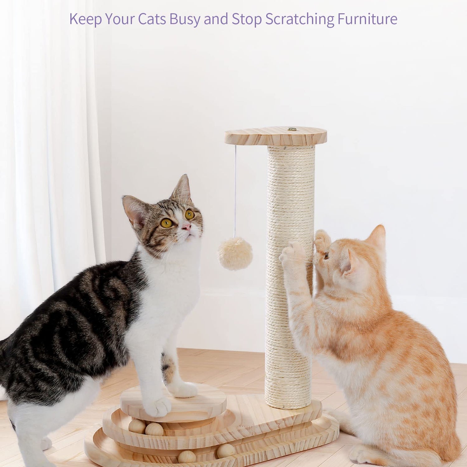 Made4Pets Cat Scratching Post Cat Scratcher Kitten Toys for Indoor Cats Wooden Ball Track Two-Layer Modern Sisal 17.7" Tall Scratch Post Interactive Toy with Dangling Ball