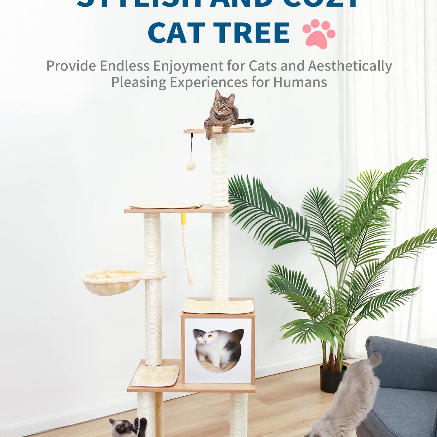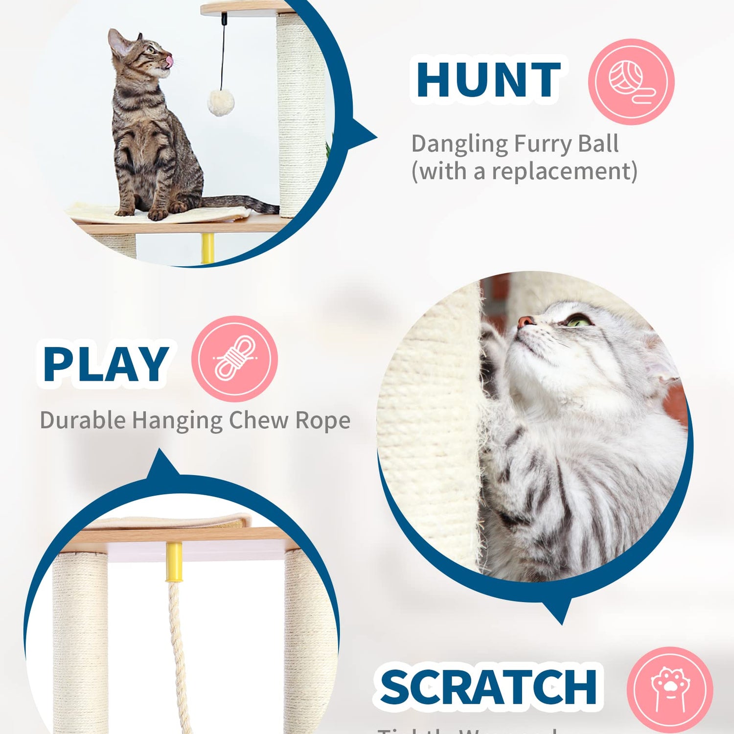 - Release Nature Instincts of Cats: The cute trouble makers who love climbing and chasing can't miss this cat tree! The hanging furry ball(with a replacement) and rope will drive them crazy!