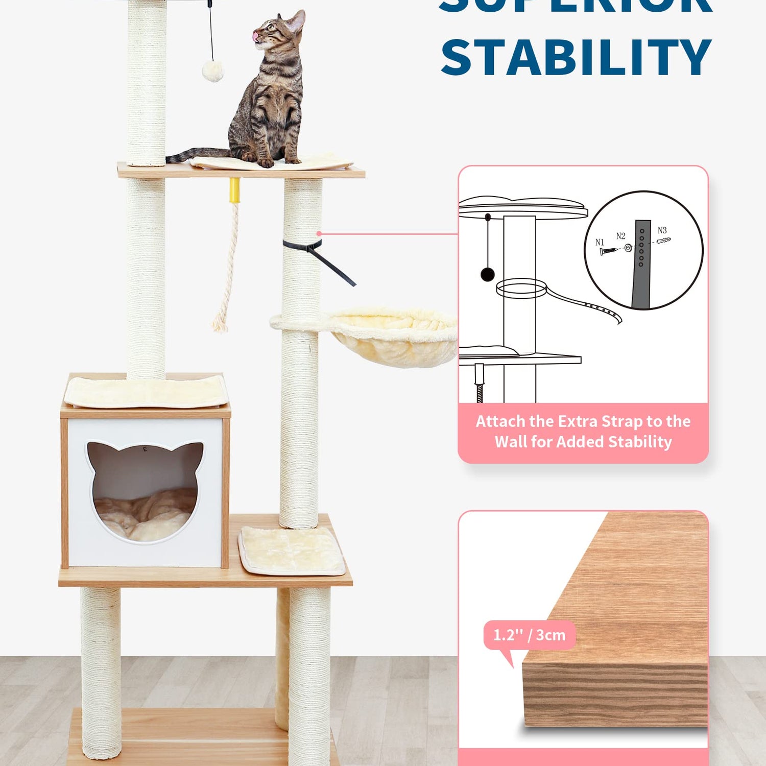 - Well-Made and Reliable: Worried about stability? It is sturdy enough for multi-cats to play. You can fasten it to the wall with the security strap, then the cats can jump up and down freely without wobbly!