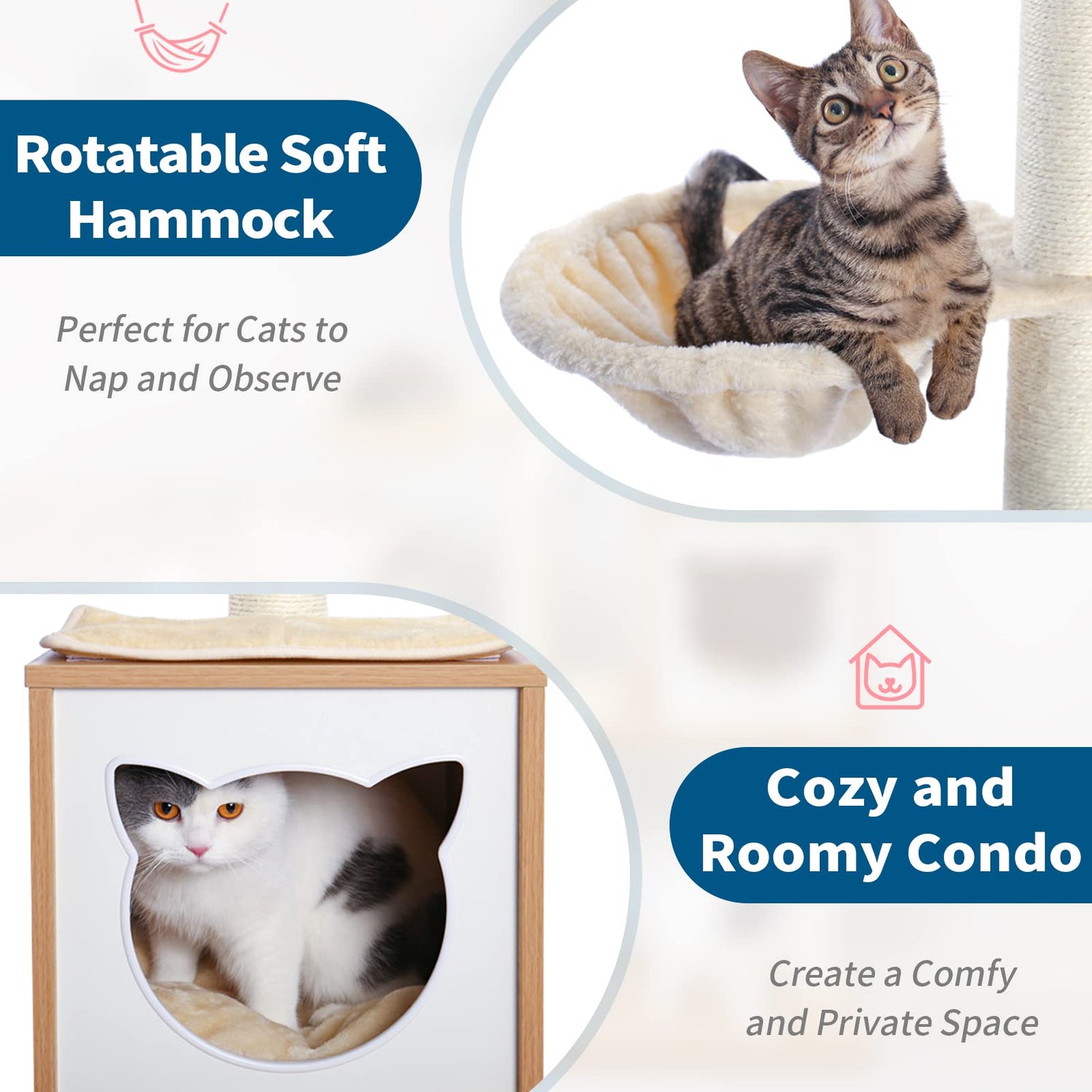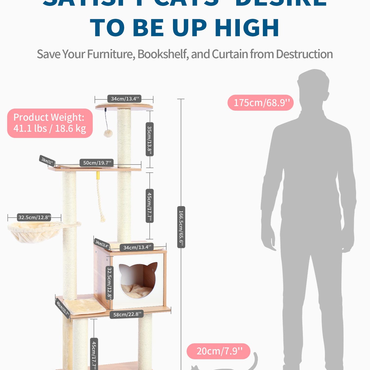 - Protect Furniture from Claws: High perch, steps, and scratch posts could save your furniture and curtains! Cat-shaped door condo and hammock allow kittens to rest after exercise.