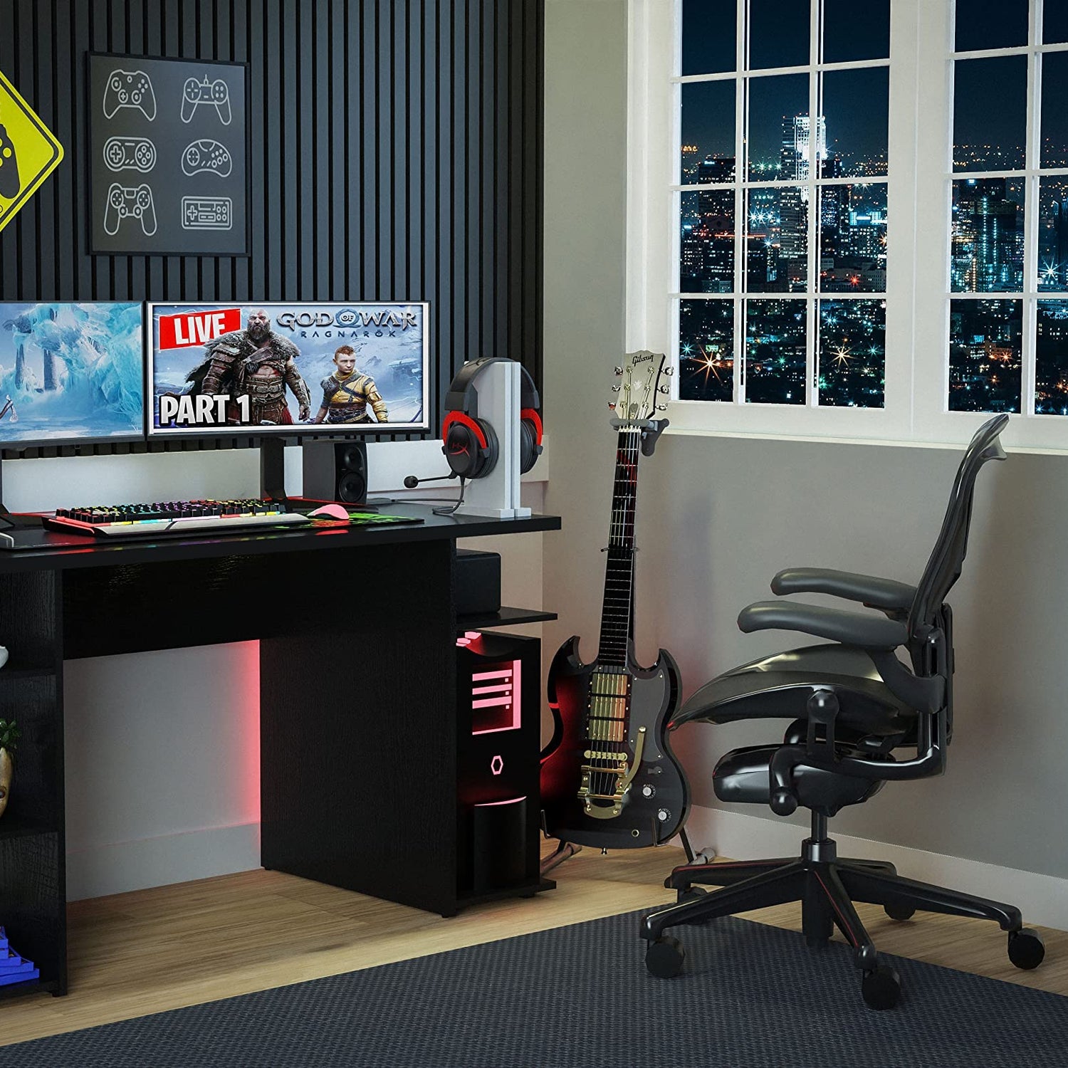 - FEATURES: Accomodates 2 monitors, with the 5 storage shelves you can easily organize your gaming stuffs, this desk has no paint finish at the back and supports up to 110 lbs - 50 Kg