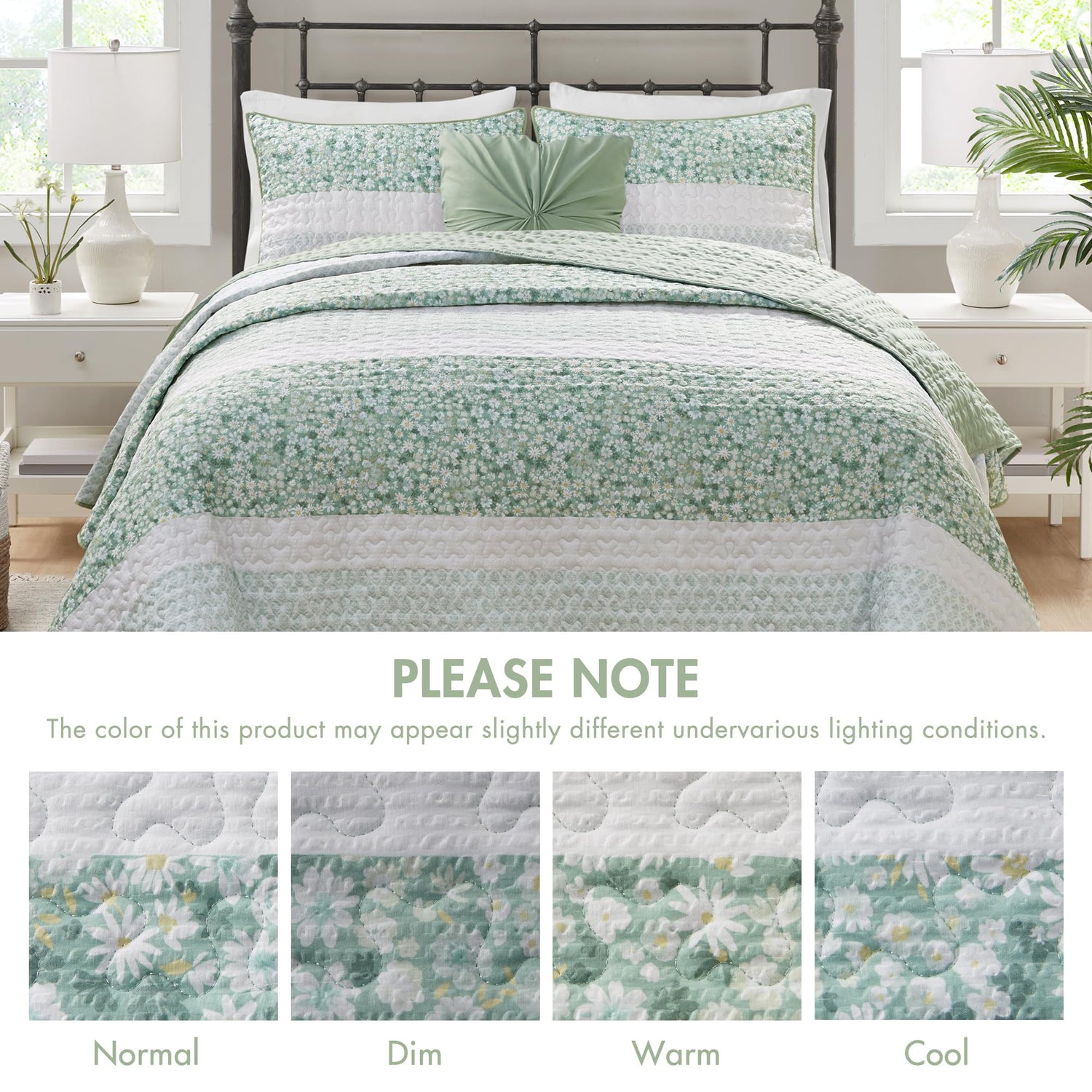 Details: Featuring three different floral and botanical print designs with a vermicelli quilt stitch pattern, this seersucker microfiber quilt set exudes shabby chic/farmhouse style that adds a touch of elegance to any bedroom. Included in the set is one square decorative pillows featuring gathered fabric, adding to the overall charm of the set. Colors featured in this set include various shade of greens, yellows, and whites. The quilt and pillows are filled with polyester filling that is treated to be dustproof, ensuring a restful and comfortable sleeping experience.