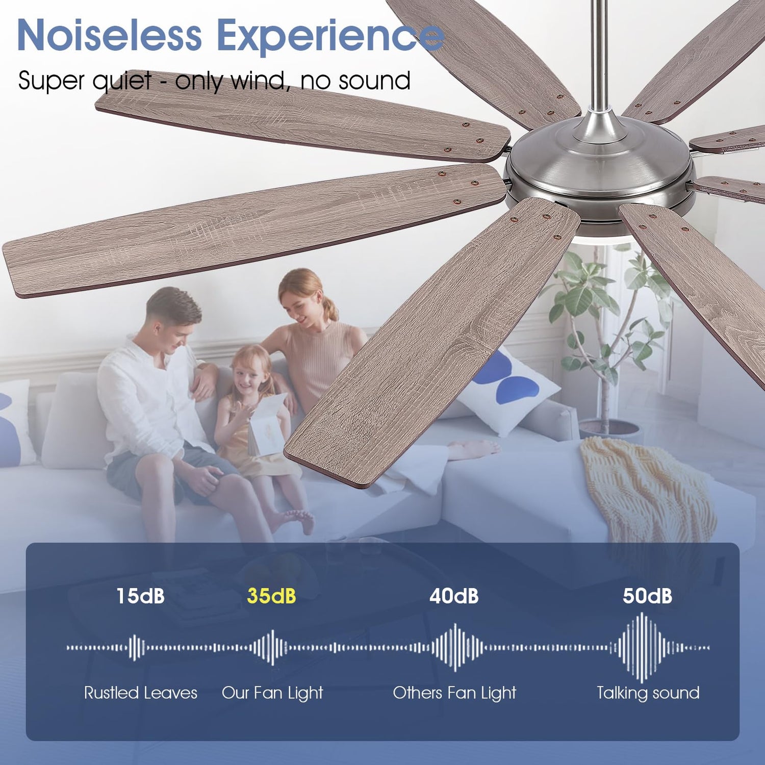 - [Large ceiling fans] : 72 Inch industrial ceiling fan equipped with superior pure copper silicon steel DC motor and 8 wooden blades,60W powerful motor can generate strong and smooth air flow of over 6900 CFM at very low noise level. suits for shops,stores, barns, offices, restaurants ,stores, barns, offices, restaurants,large houses, and other commercial places