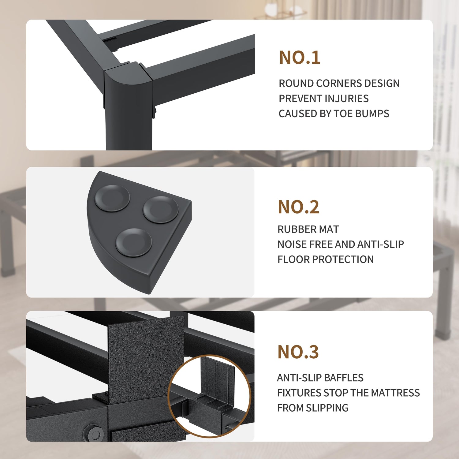 - Anti-Slip Design: The queen bed frame has extra plastic anti-skid baffles on all four sides to prevent the mattress from slipping, as well as rubber foot cushions to prevent the queen metal bed frame from sliding and protect the floor from scuffing while reducing noise.