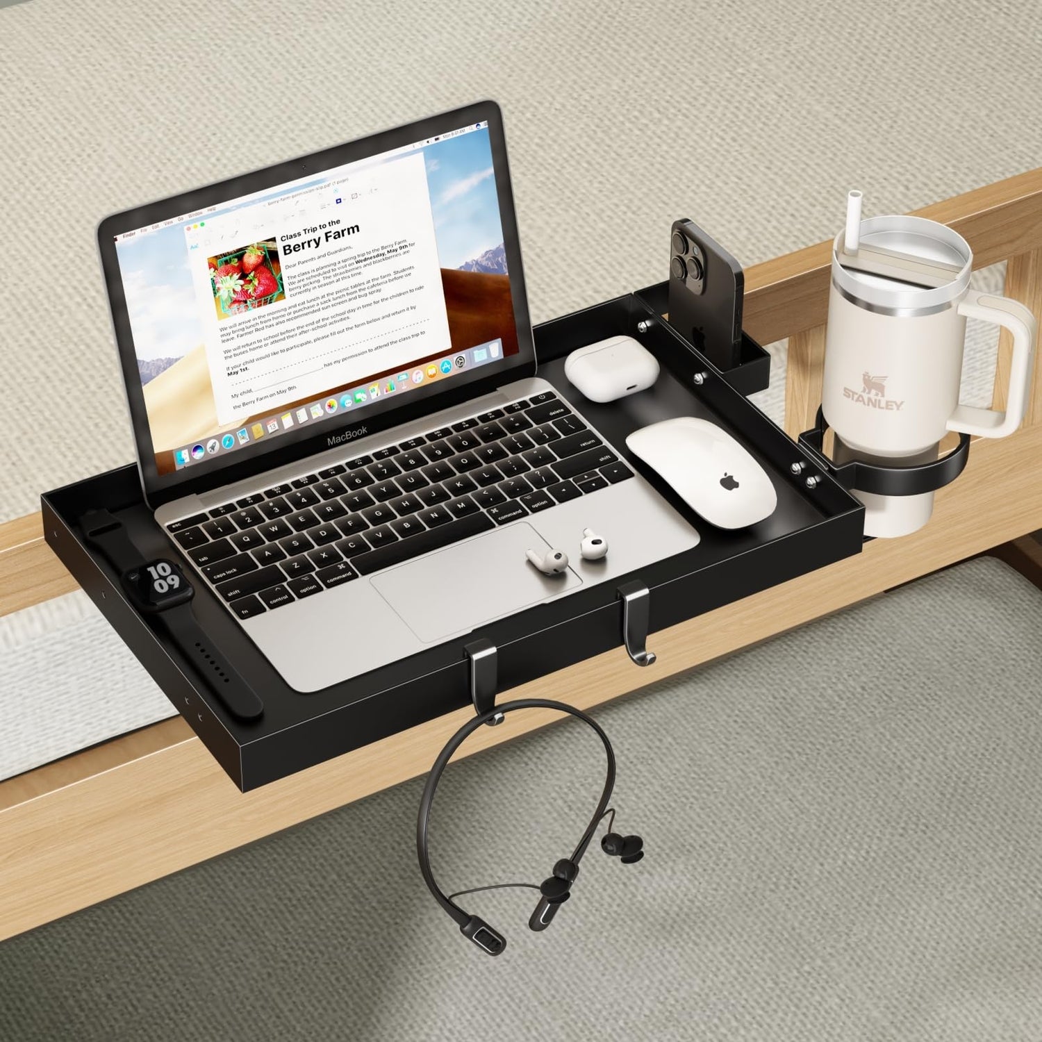 - 【Thoughtful Design】There are EVA foam pads in the cup holder and phone holder to prevent your phone or water cup from being scratched by the metal edge. There are also 3 T-shaped wire holes on the shelf, which is convenient to charge your phone, iPad, or laptop. The additional plastic pad makes it easier for you to clean the shelf and protect your items from scratches. So many thoughtful designs are just to bring you a more comfortable user experience.
