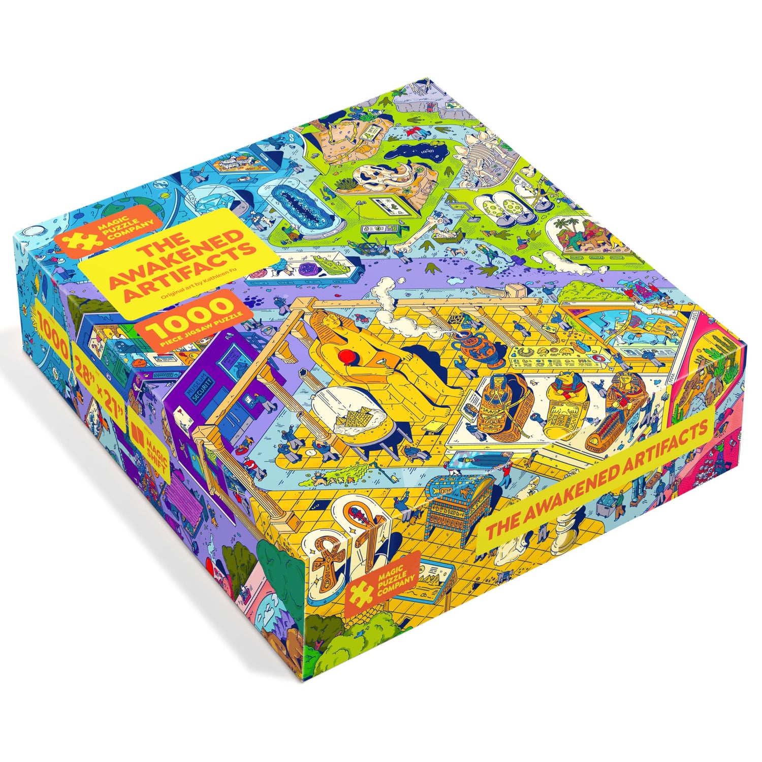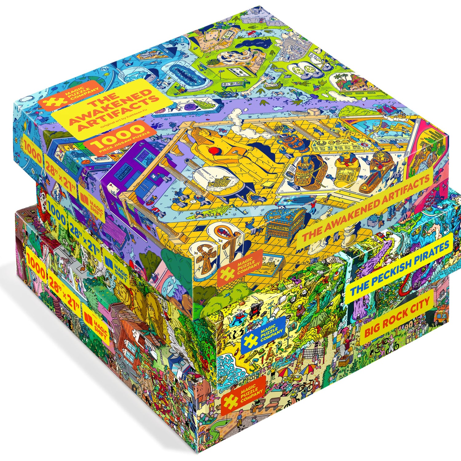 Details: Big Rock City, The Awakened Artifacts, & The Peckish Pirates are three 1000-piece jigsaw puzzles that do a magic trick when you solve them. They feature all-new original art packed with hundreds of tiny details and easter eggs to discover. We've designed (and playtested) our puzzles to make the experience as smooth and engaging as possible from the moment you open the box to the moment you place the last piece of the last segment.