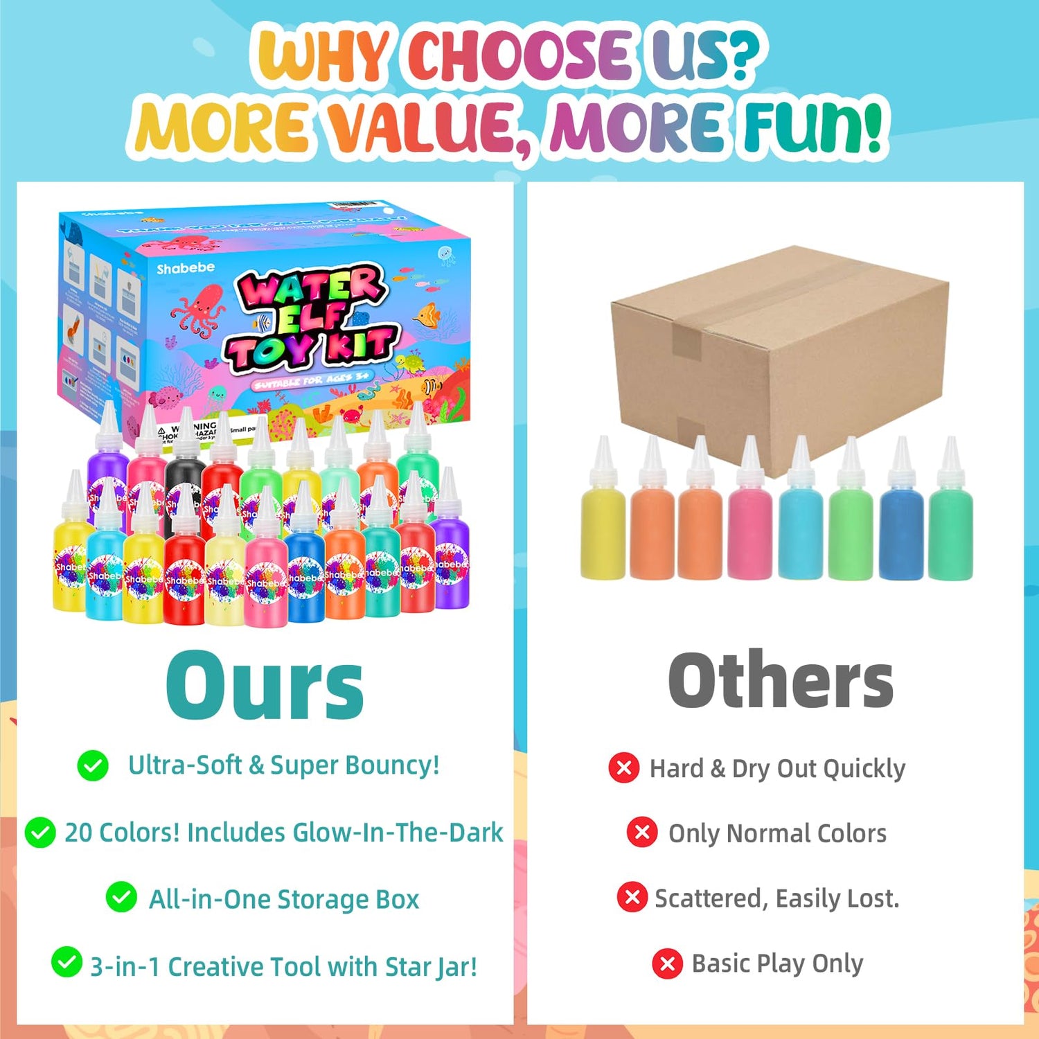 - ULTIMATE CREATIVITY KIT – A BRAIN-BOOSTING MEAL FOR KIDS! For less than the price of a pizza, spark your child’s imagination with this all-in-one creative kit! Includes 18 animal & sea creature molds, 20 colorful gels (14 regular, 4 pearl, 2 glow-in-the-dark), a star jar, 4 magic powders, net, storage box & simple instructions. Designed for kids 3+, it promotes color and shape exploration while offering endless fun making magical water elves. Packed with value, it's a smart and fun way to support your child’s growth!