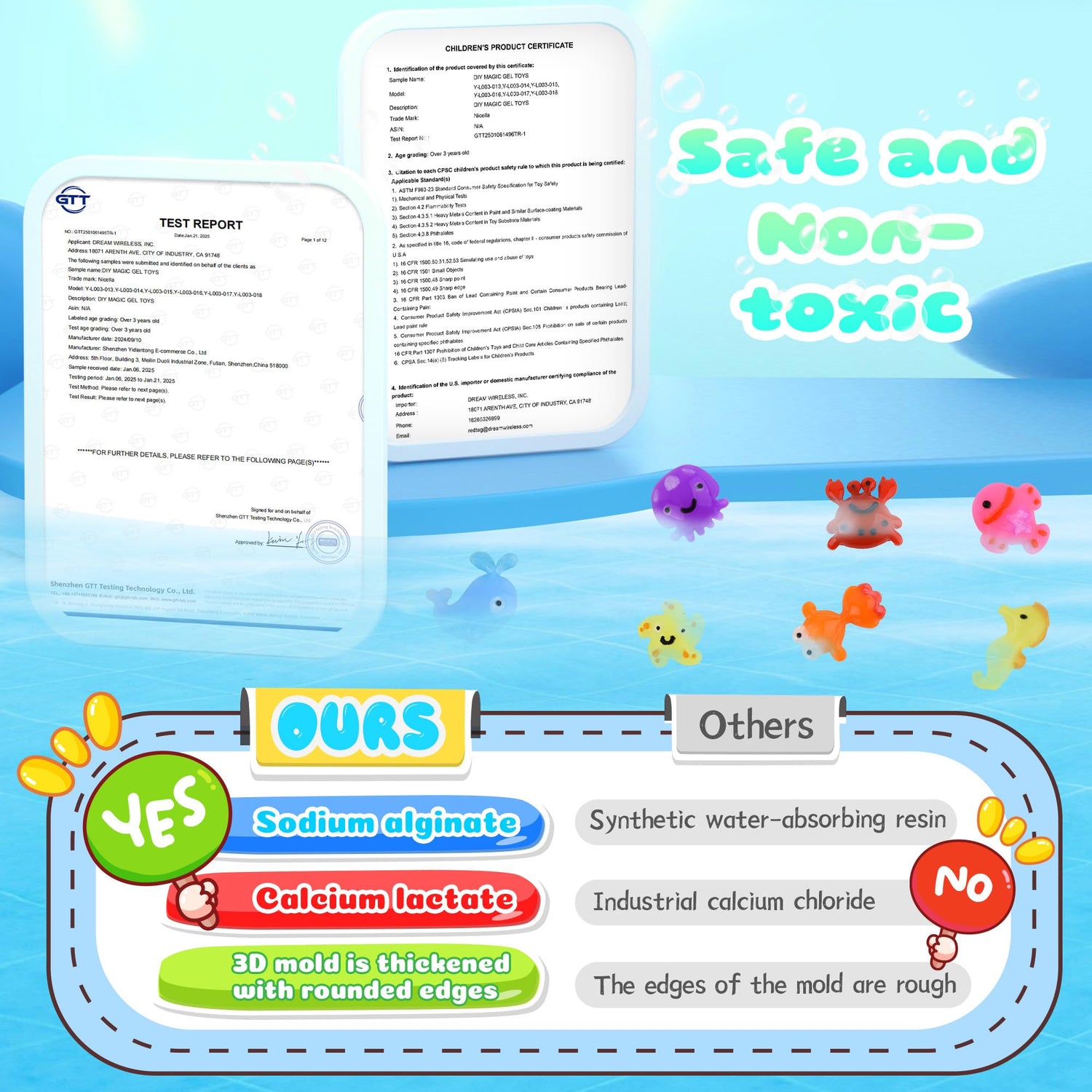- 🧼 【Safe and Easy to Use】This aqua fairy water gel kit is environmentally friendly and non-toxic, ensuring that children can enjoy DIY fun with peace of mind. The colorful bottles are soft enough for little hands to squeeze. The edges of the molds are smooth. The magic gel is made from a substance extracted from natural seaweed, and the magic powder is food-grade calcium lactate. All materials have passed rigorous testing in international laboratories. The aqua jelly gel kit also comes with disposable gloves and a storage box, minimizing clutter and facilitating organization.