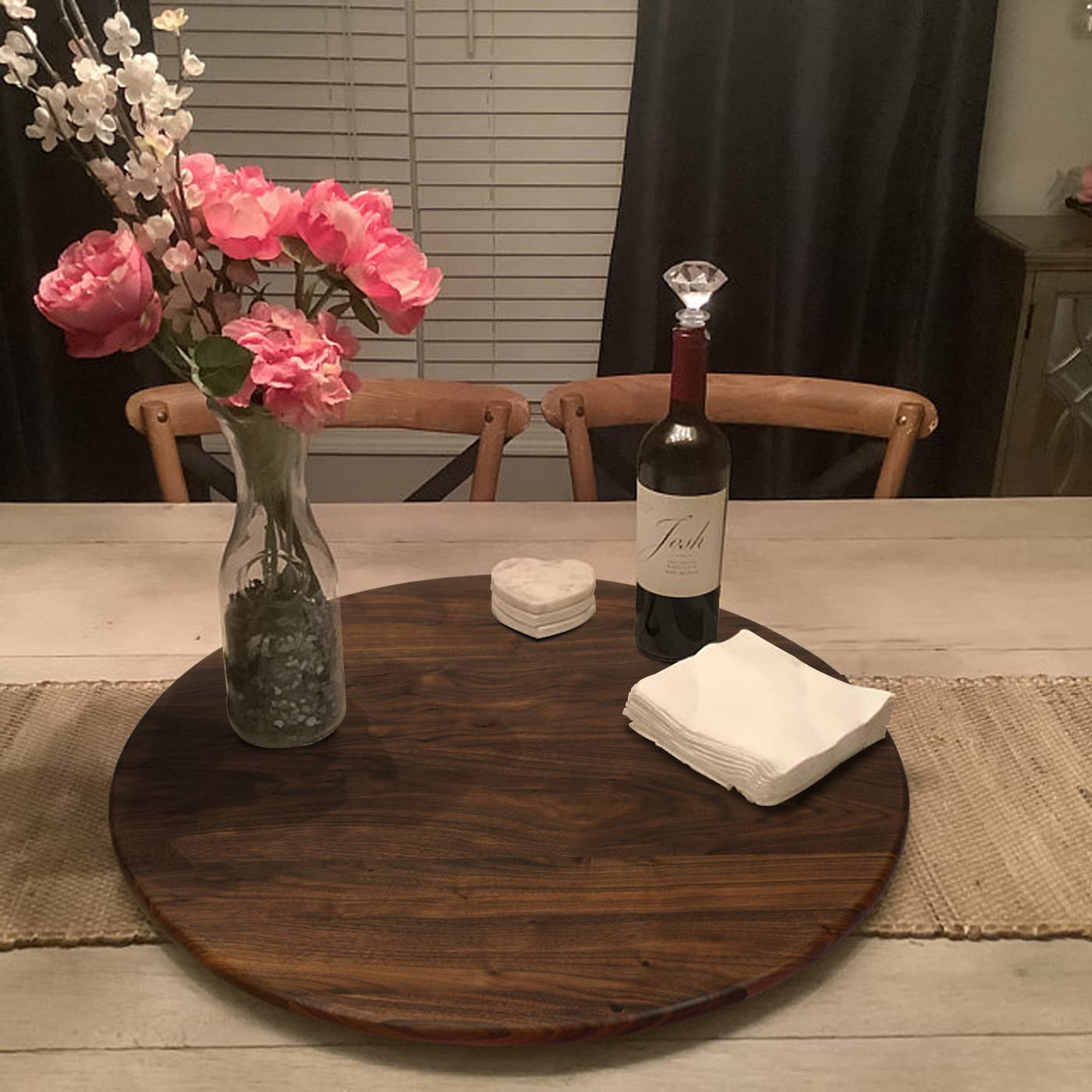 - Classic and premium walnut turntable, large sized, simple and elegant design. After production, the tray is then double-finished with two layers of food safe natural soybean oil, Features a rich, natural dark finish; Adds a touch of luxury to any kitchen, dining room, or living area.