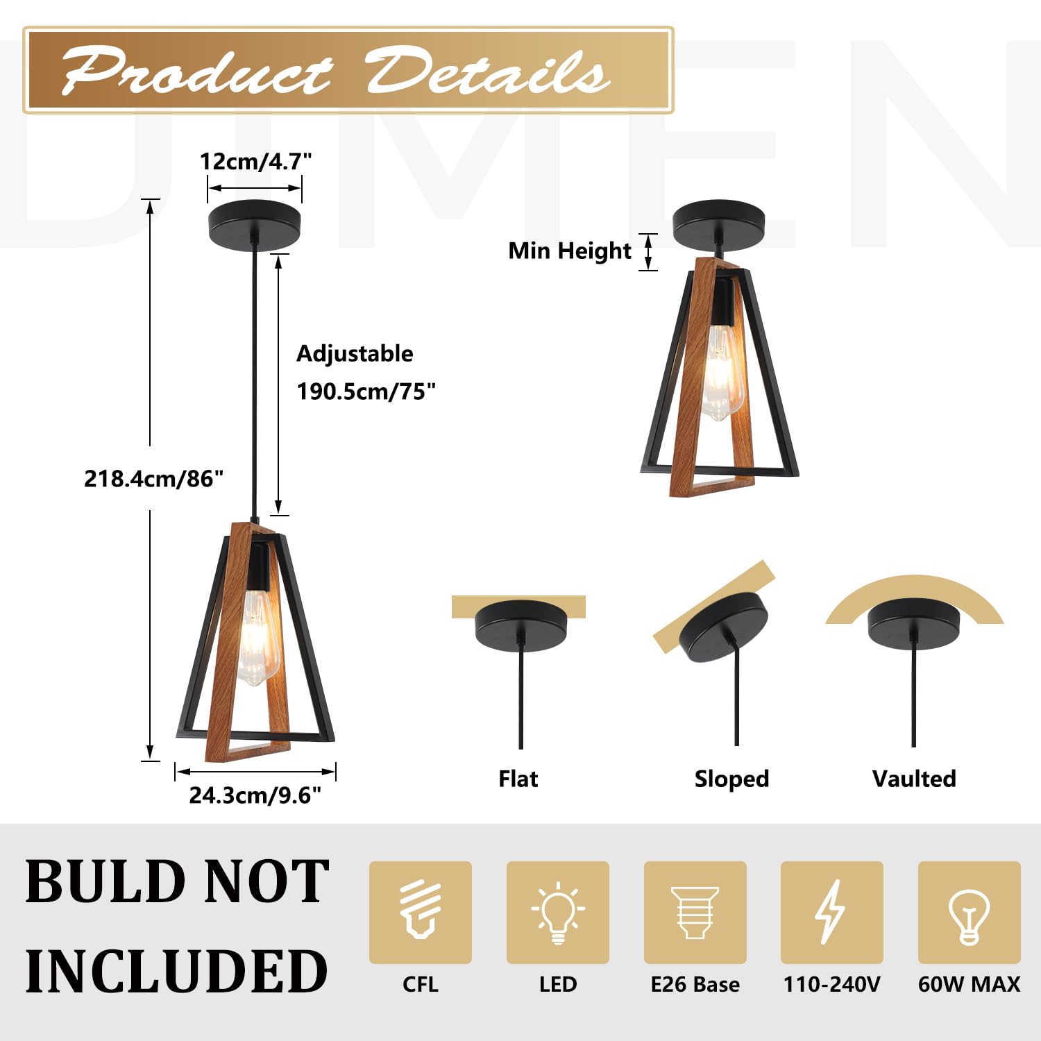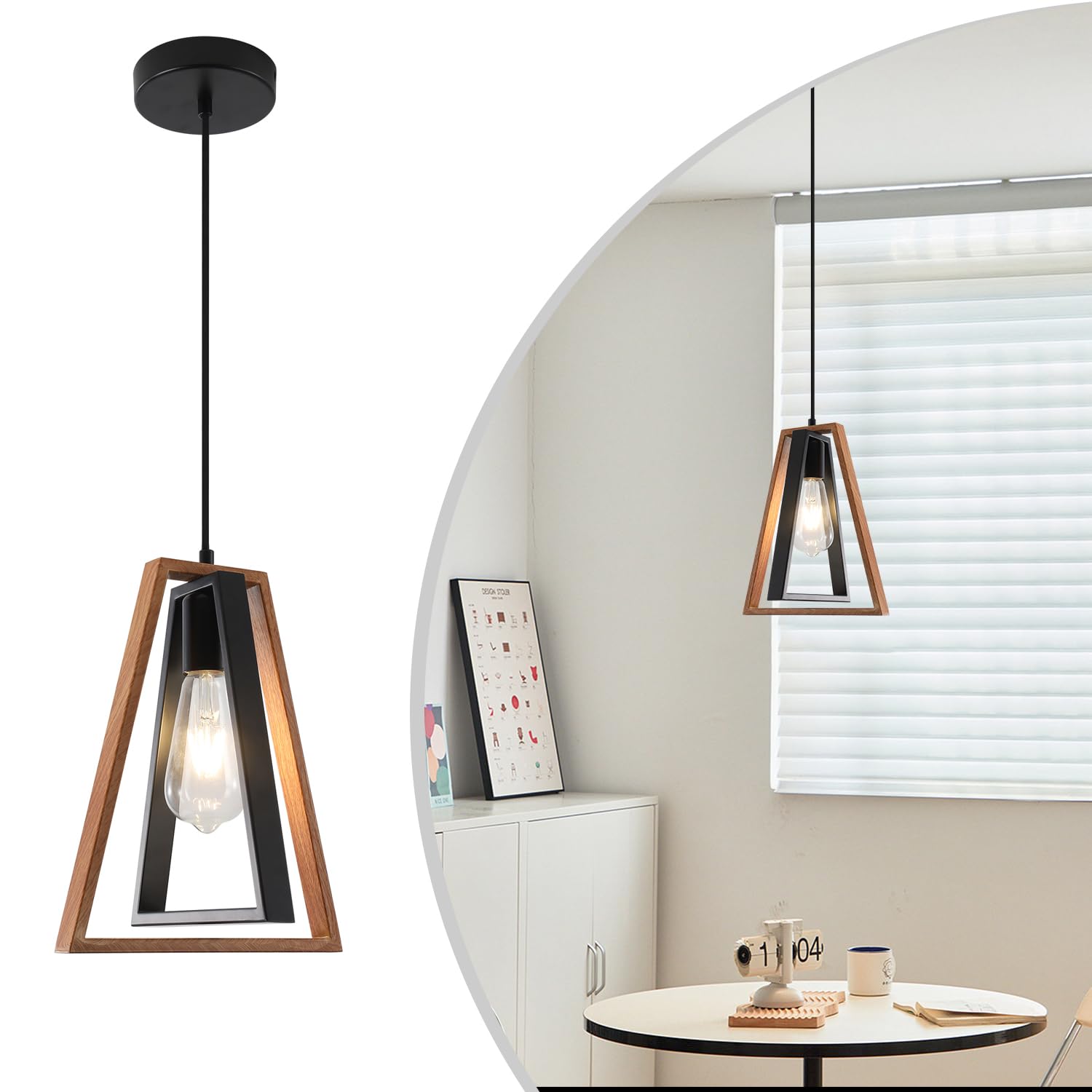- Height Adjustable: The black metal and wood pendant light with one strand suspension wires 59.1in (150cm adjustable suspension wire),sturdy and durable, compatible with various kinds of flat or sloped ceilings, you can adjust the hanging height as per your request, perfect for low ceilings and high ceilings