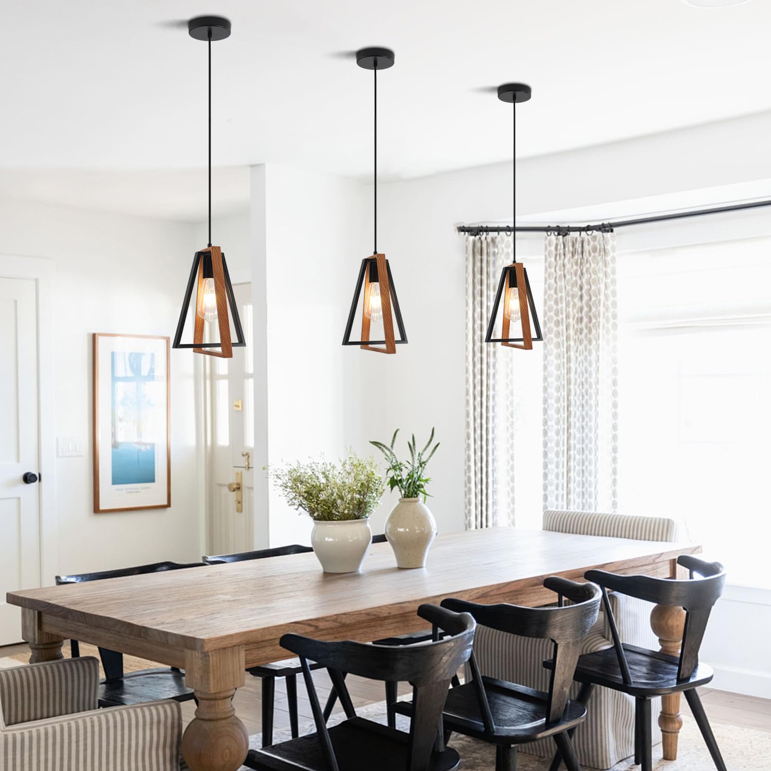 - Modern Farmhouse Wood Series: The farmhouse pendant light is made of metal frame,The soft ambient light over your house and provide a warm ambiance. Perfect for your kitchen island, dining room, living room, bedroom, hallway, etc. And add natural texture to every living space