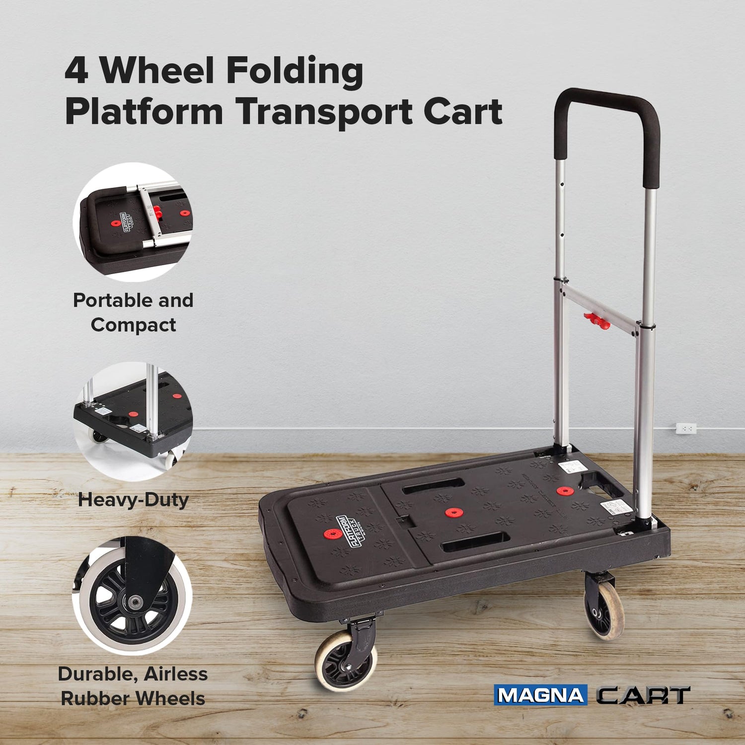 Details: Easily transport heavy items around your home, garage, or office with the Magna Cart FF Foldable Platform Utility Cart with 4 Rubber 360-Degree Rotating Wheels. For easy and reliable carrying and transferring of any household goods and accessories, office supplies, garage tools, lawn and landscaping items, and more, look no further than this platform cart by Magna Cart! This foldable rolling cart has a 300-pound capacity to help move heavy toolboxes, bulky items, cleaning supplies, books, or other items to where you need them. This folding platform cart features a tall telescoping handle extending up to 36 inches tall, so you can easily move the metal cart dolly from one place to another. Swiftly turn corners using the 4 durable rubber wheels that rotate 360 degrees for ease of use. When not in use, the wheels and handle of this metal utility heavy duty cart can fold to a compact 4-inch height, making it flat enough to take with you in your car or put in a small-sized apartment, classroom, garage, or storage space. Overall, this collapsible flatbed cart with wheels measures 26 inches long, 16 inches wide, and 3.5 inches tall when folded. Make any moving job around your home or office quick and easy with the use of the Magna Cart FF Foldable Platform Utility Cart with 4 Rubber 360-Degree Rotating Wheels.