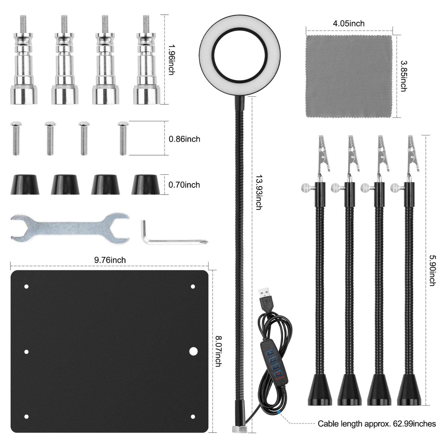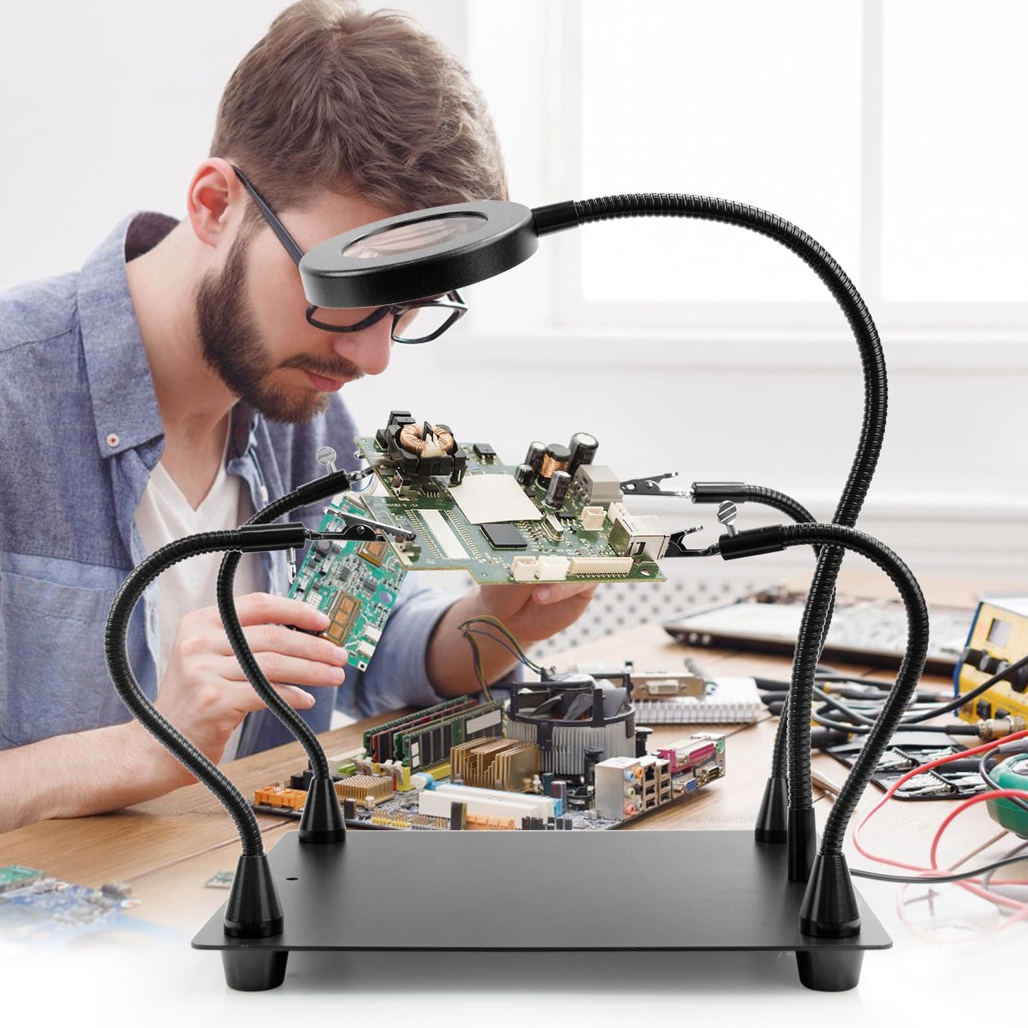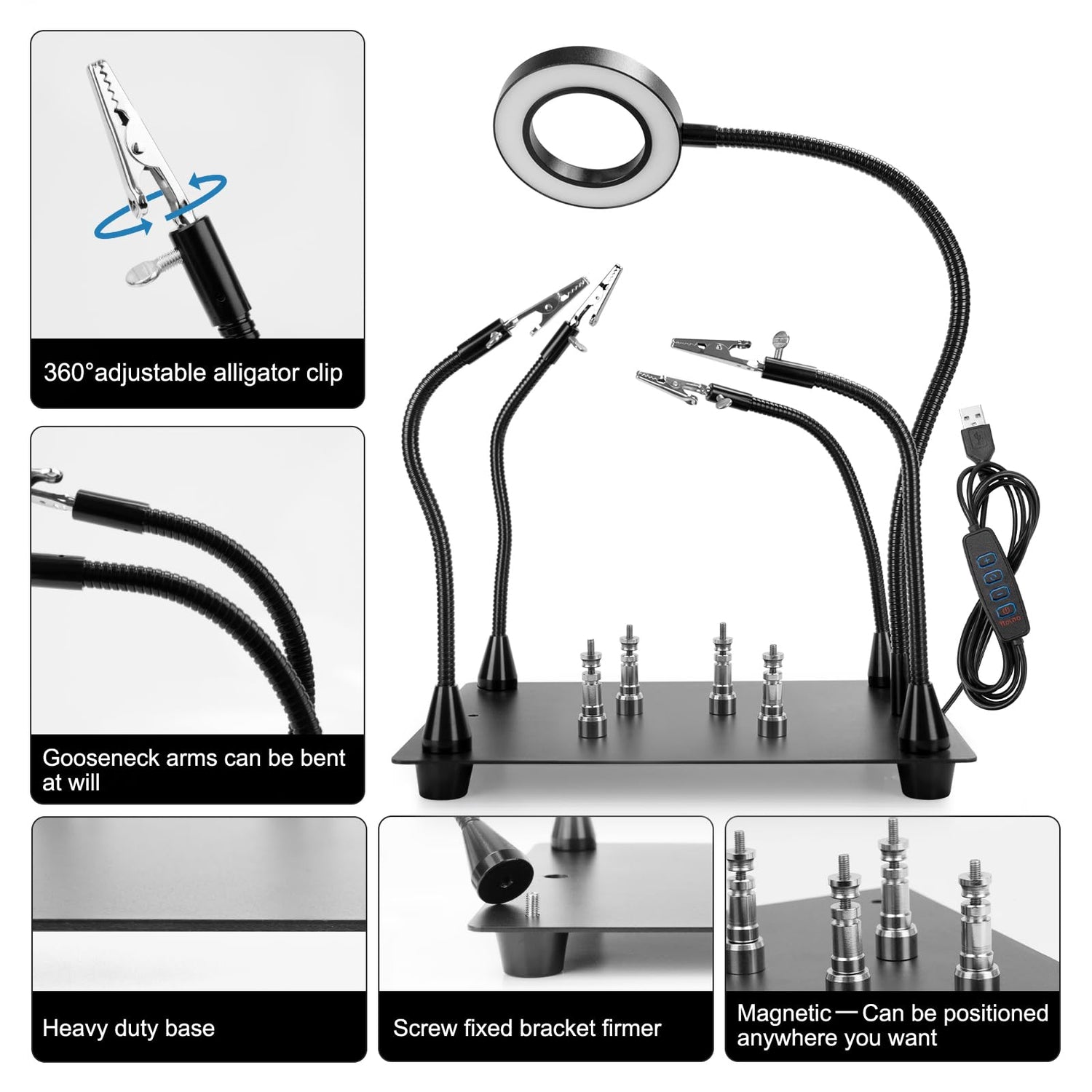 - Package Included & Widely Use:1*solid metal base,1*LED magnifying glass, 4*flexible arm with alligator clip, 4*rubber cover, 4*Phillips screws,4*Metal Magnet Small Tower,1*mini wrench, 1*mini Phillips screwdriver, 1*cleaning cloth, 1*user manual. Perfect for widely used in soldering, electronic repair, crafting, and modeling, assembly, maintenance, jewelry etc.