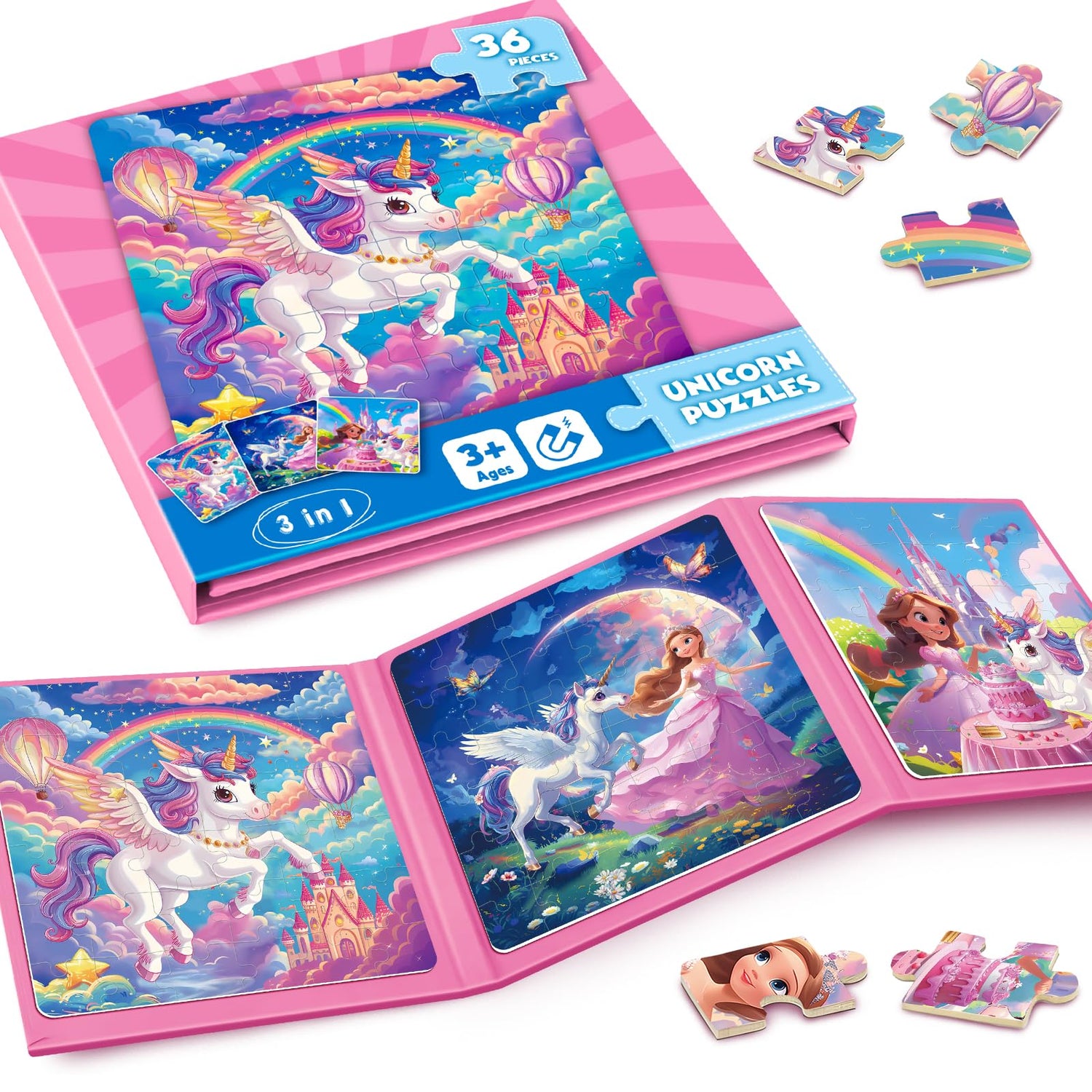 - Unicorn and Princess Themed Magnetic Puzeels Set: Delight your little girls with magnetic puzzles featuring engaging unicorn and princess scenes. The kids puzzles book includes three 36-piece puzzles designed to inspire creativity and fun for your kids. These three pattern designs can be combined to create a fun and magical story of a unicorn and princess celebrating a birthday together.The toddler puzzles in a compact, fold-out design,easy to carry.
