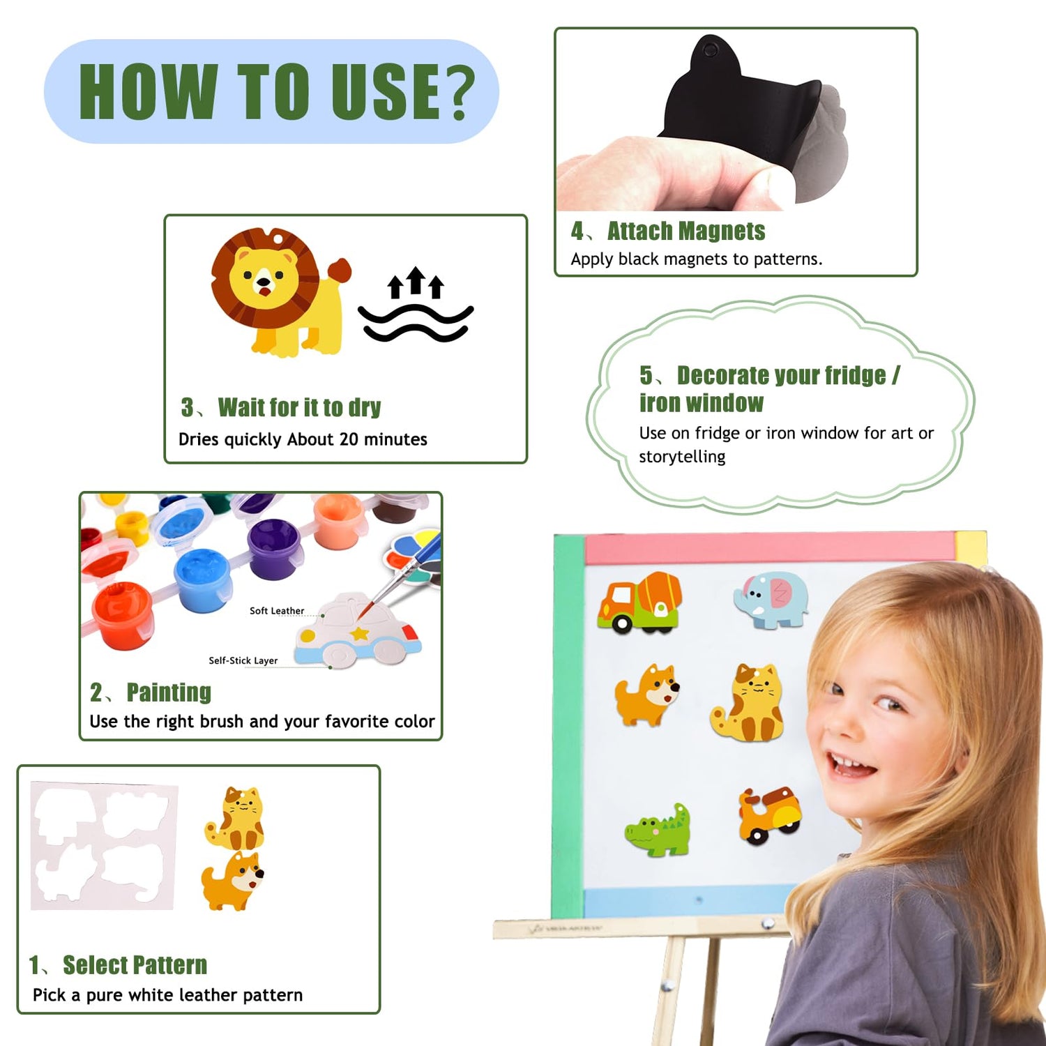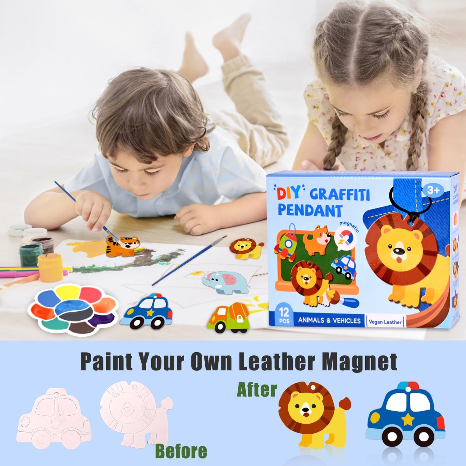 - DIY Magnetic Painting Kits for Kids Ages 4-8: Includes soft leather pendants in 6 Animal and 6 Vehicle shapes. These kids painting set magnets are safe and fun for kids