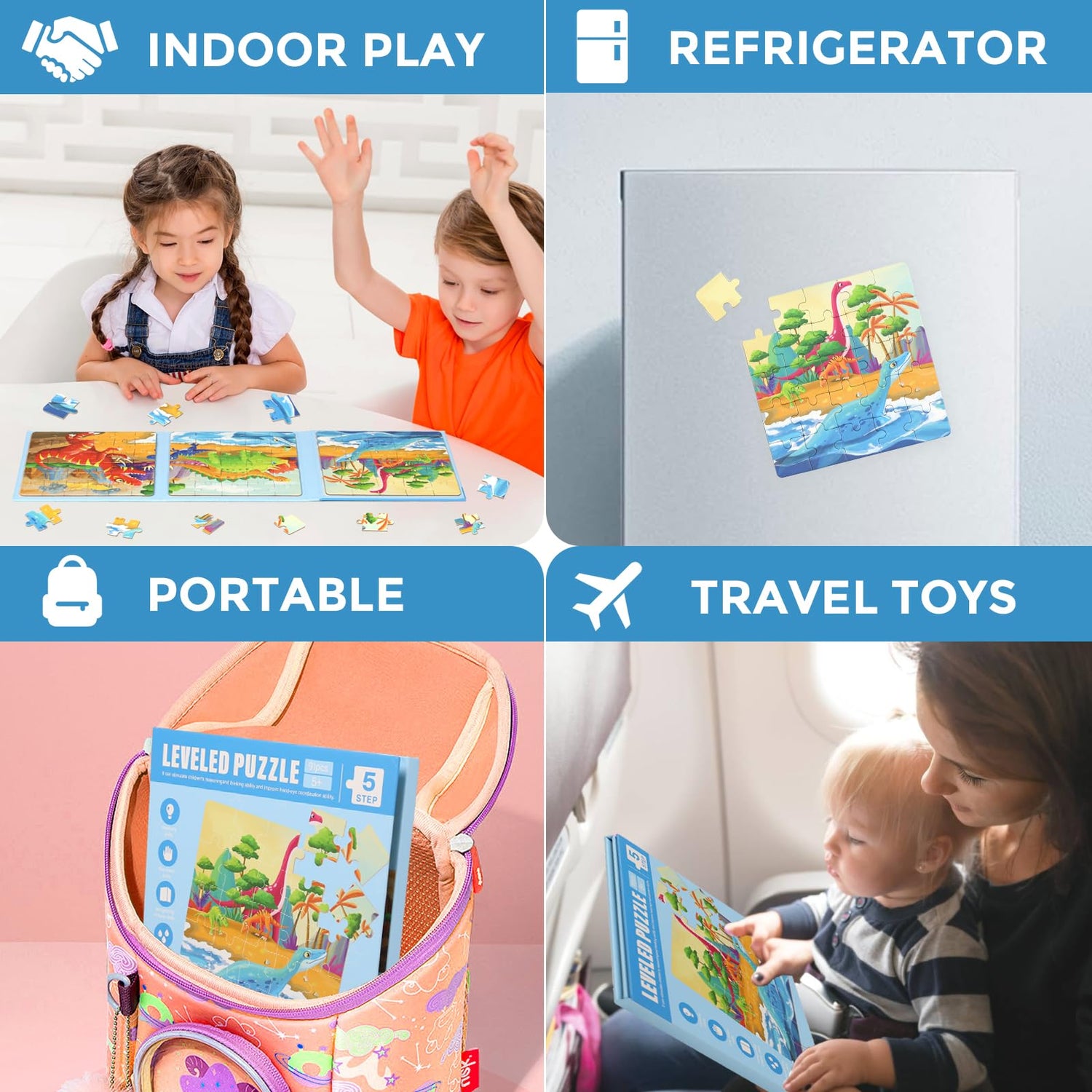 - 3 IN 1 KID PUZZLE: This set of dinosaurs magnetic puzzle has 3 parts with colorful images.There are 25, 30 and 36 puzzle pieces, 91 in total, ranging from easy to difficult, full of fun and challenges, helps kid develop motor skills and improve logical think